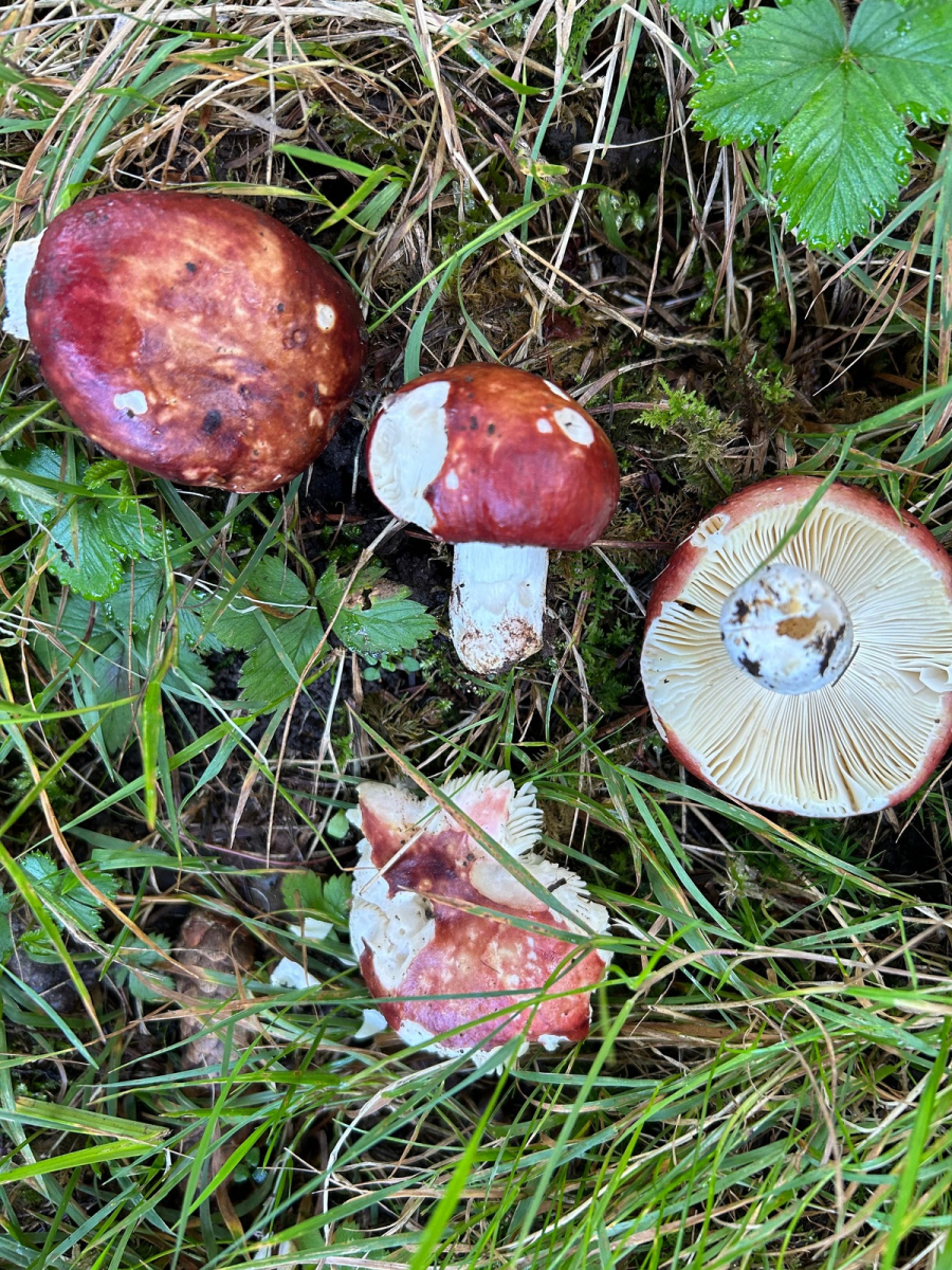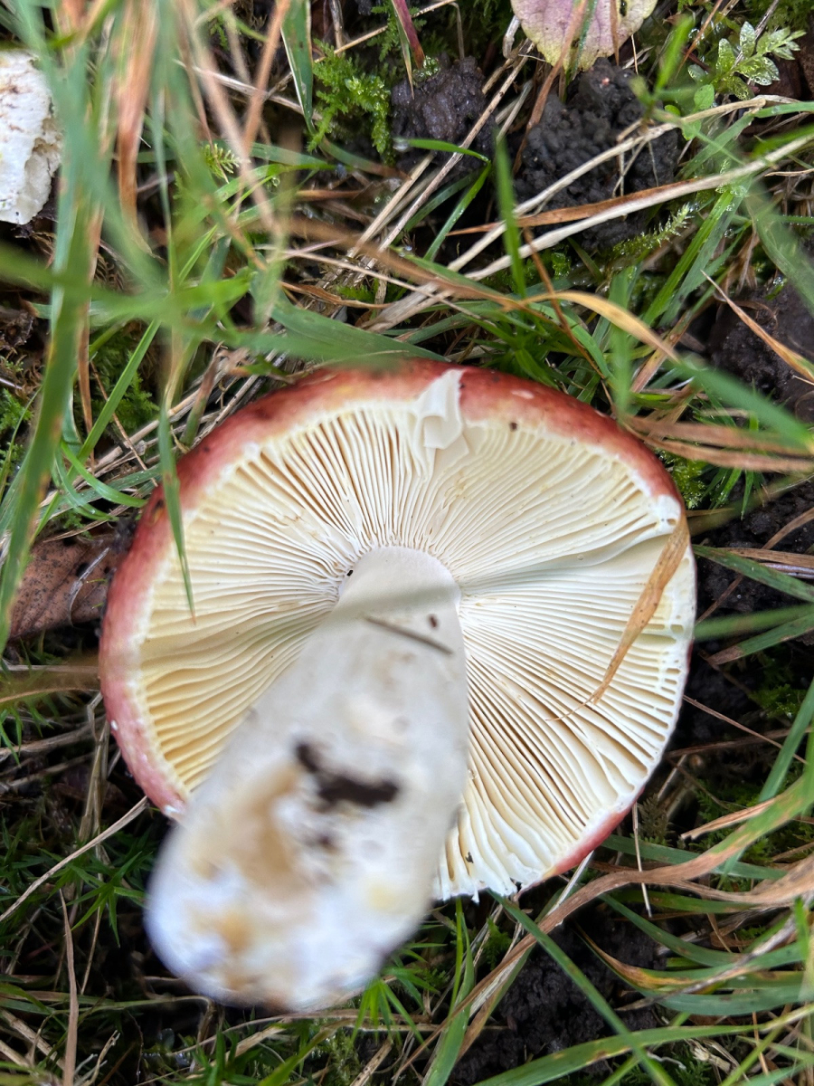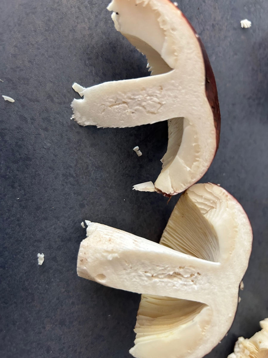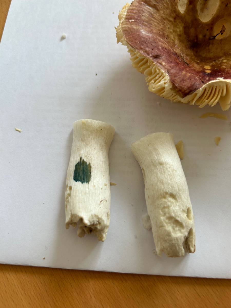Allerdings waren die Hüte mehr matt und nicht so glänzend wie dein Pilz 2+3 was ja mehr für R. integra sprechen würde, auch die Stieloberfläche wurde bei denen an den Berührungsstellen und auch im Schnitt leicht gräulich. (Bild könnte ich liefern)