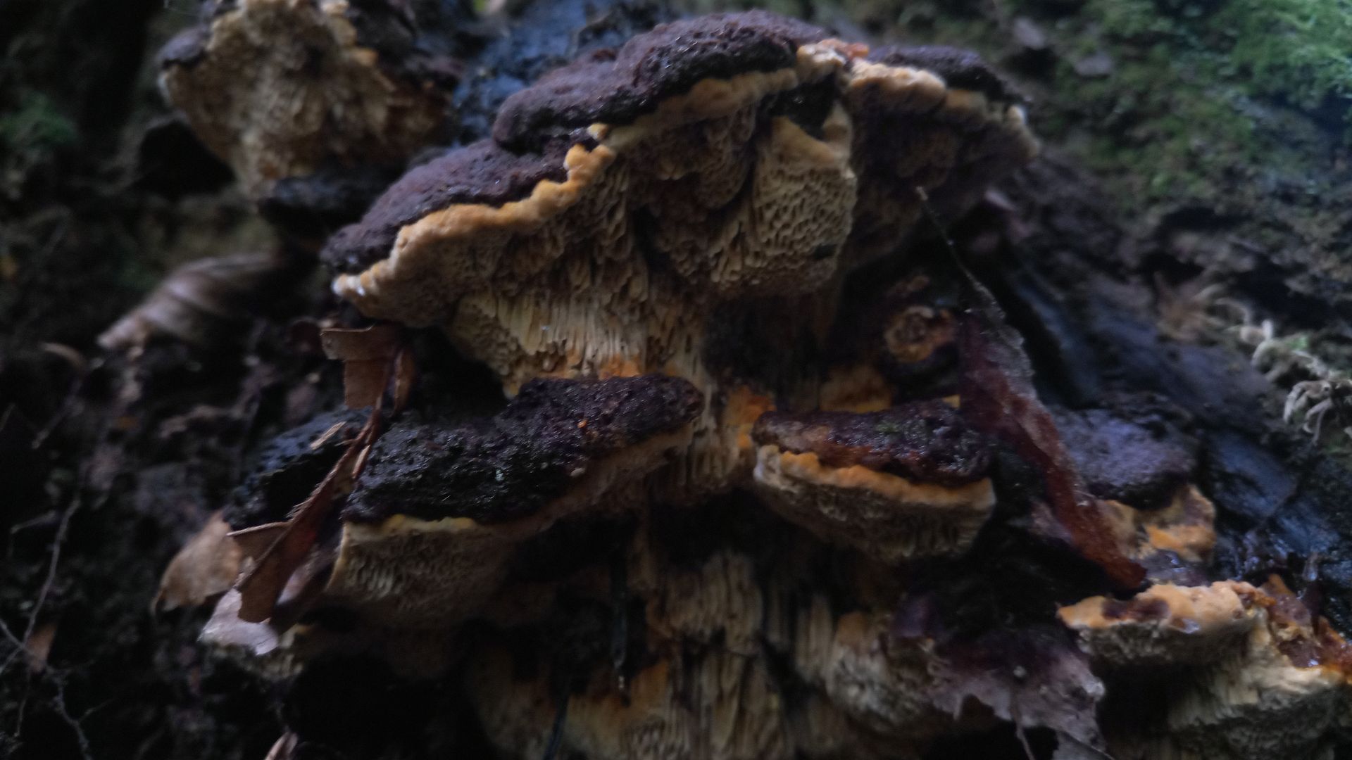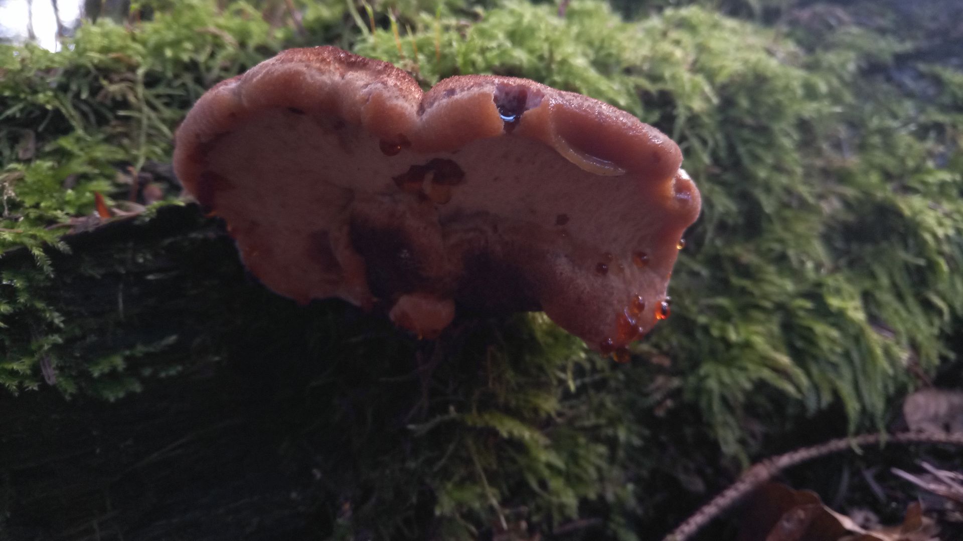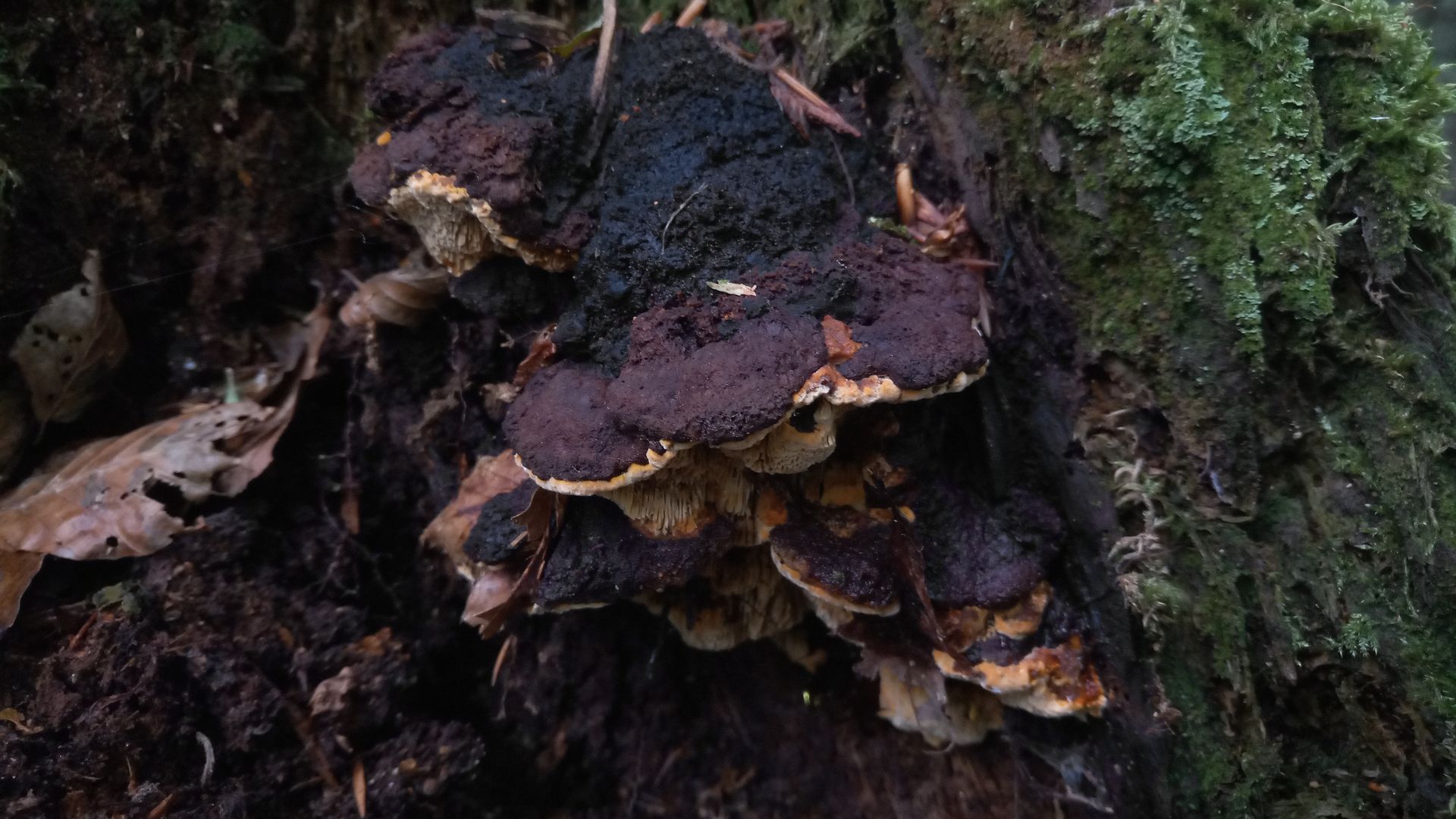 Dein erster Pilz ist kein Leberreischling, sondern der Schwarzgebänderter Harzporling Ischnoderma benzoinum, typisch auf Fichte. Dann folgen jede Menge Fenchelporlinge und was schwarzes Hinübernes. Am Schluss zeigst Du richtig erkannt: einen Schleimpilz. Aber der ist noch im plasmoiden Zustand, also innen flüssig. Plasmodien kann man nicht bestimmen. Das geht erst, wenn sie ausgereift = fest sind. Dabei ändern sie sich wie genauso heftig wie eine Raupe, die zum Schmetterling wird – nur mit dem Unterschied, dass man eine Raupe dem Schmetterling zuordnen kann, beim Plasmodium geht das nur in den seltensten Fällen, hier ist dies nicht möglich. Aber schöne Bilder von dem wandernden Plasmodium!