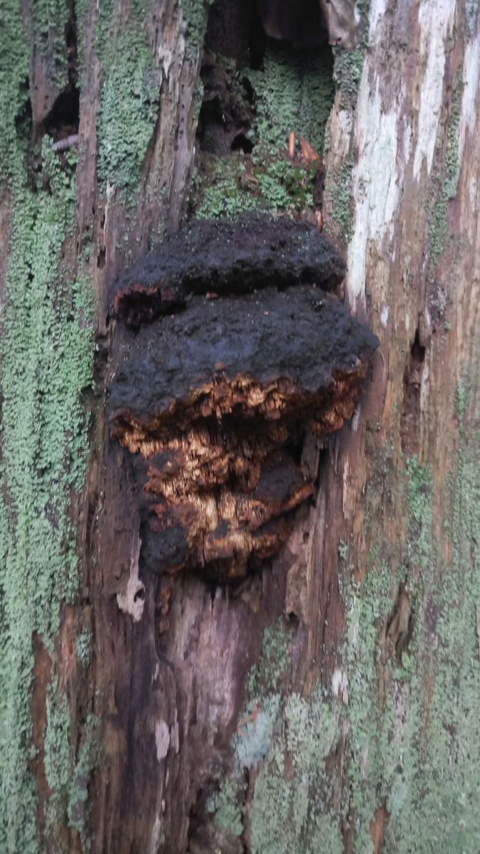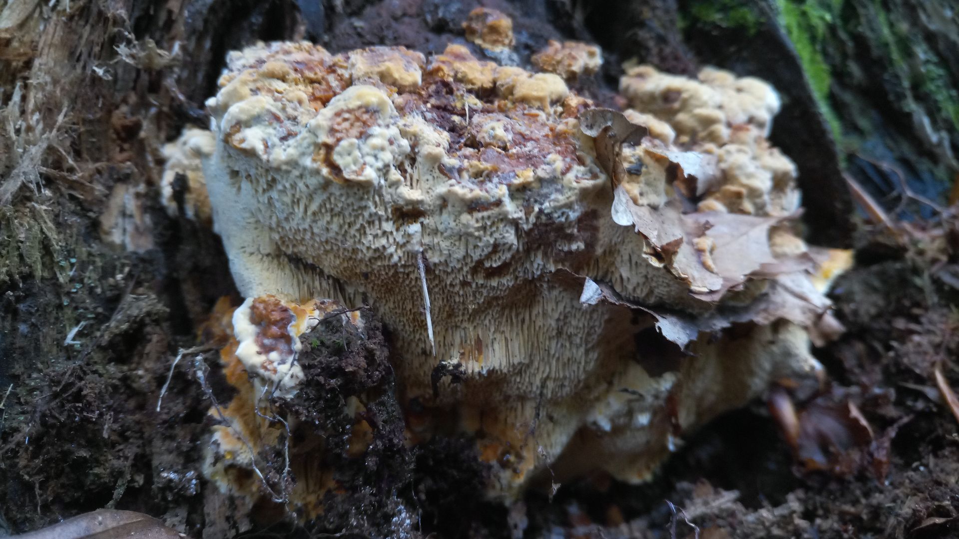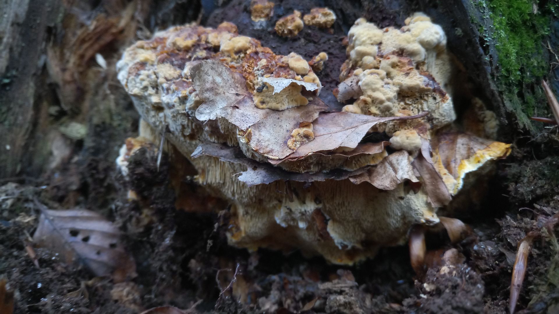Dein erster Pilz ist kein Leberreischling, sondern der Schwarzgebänderter Harzporling Ischnoderma benzoinum, typisch auf Fichte. Dann folgen jede Menge Fenchelporlinge und was schwarzes Hinübernes. Am Schluss zeigst Du richtig erkannt: einen Schleimpilz. Aber der ist noch im plasmoiden Zustand, also innen flüssig. Plasmodien kann man nicht bestimmen. Das geht erst, wenn sie ausgereift = fest sind. Dabei ändern sie sich wie genauso heftig wie eine Raupe, die zum Schmetterling wird – nur mit dem Unterschied, dass man eine Raupe dem Schmetterling zuordnen kann, beim Plasmodium geht das nur in den seltensten Fällen, hier ist dies nicht möglich. Aber schöne Bilder von dem wandernden Plasmodium!