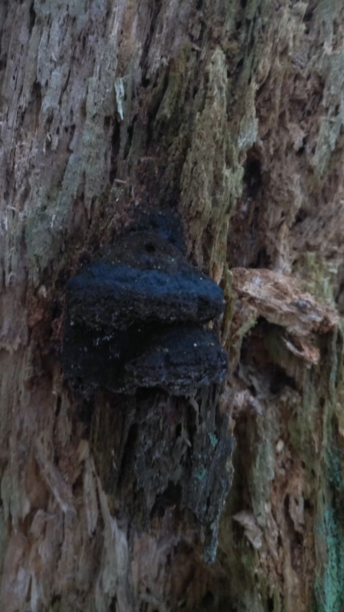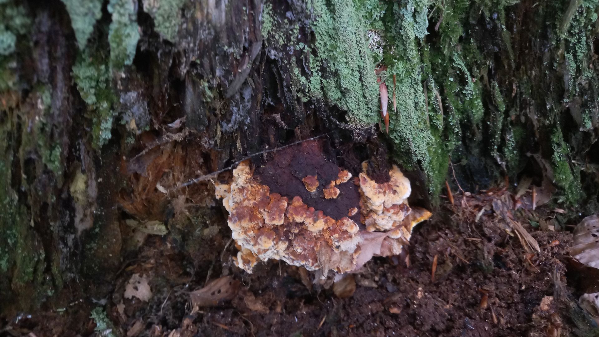 Pilz 2 wuchs an dem Baumstrunk f). Keine Ahnung, was das für eine Baumart war. Es hatte rund herum etliche Fruchtkörper, die ich alle als die gleiche Art einschätze. Die Fruchtkörper sind ausgesprochen dick, vermutlich mehrjährig, grobporig. Könnte es sich um einen Feuerschwamm (Phellinus sp.) handeln? Um welchen wohl?