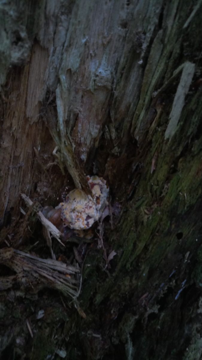Pilz 1 wuchs an einem schon reichlich verrotteten Baumstamm mit Braunfäule (ich vermute Fichte, wegen den vielen gleichmässigen Ästen und dem graden Wuchs). Für mich ist das ein Leberreischling/Ochsenzunge (Fistulina hepatica). Aber an Nadelholz, das bereits dermassen verrottet ist?? Ich kenne den an lebenden Eichen.