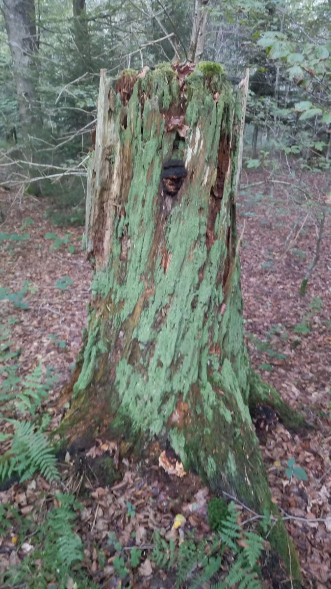 Pilz 2 wuchs an dem Baumstrunk f). Keine Ahnung, was das für eine Baumart war. Es hatte rund herum etliche Fruchtkörper, die ich alle als die gleiche Art einschätze. Die Fruchtkörper sind ausgesprochen dick, vermutlich mehrjährig, grobporig. Könnte es sich um einen Feuerschwamm (Phellinus sp.) handeln? Um welchen wohl?