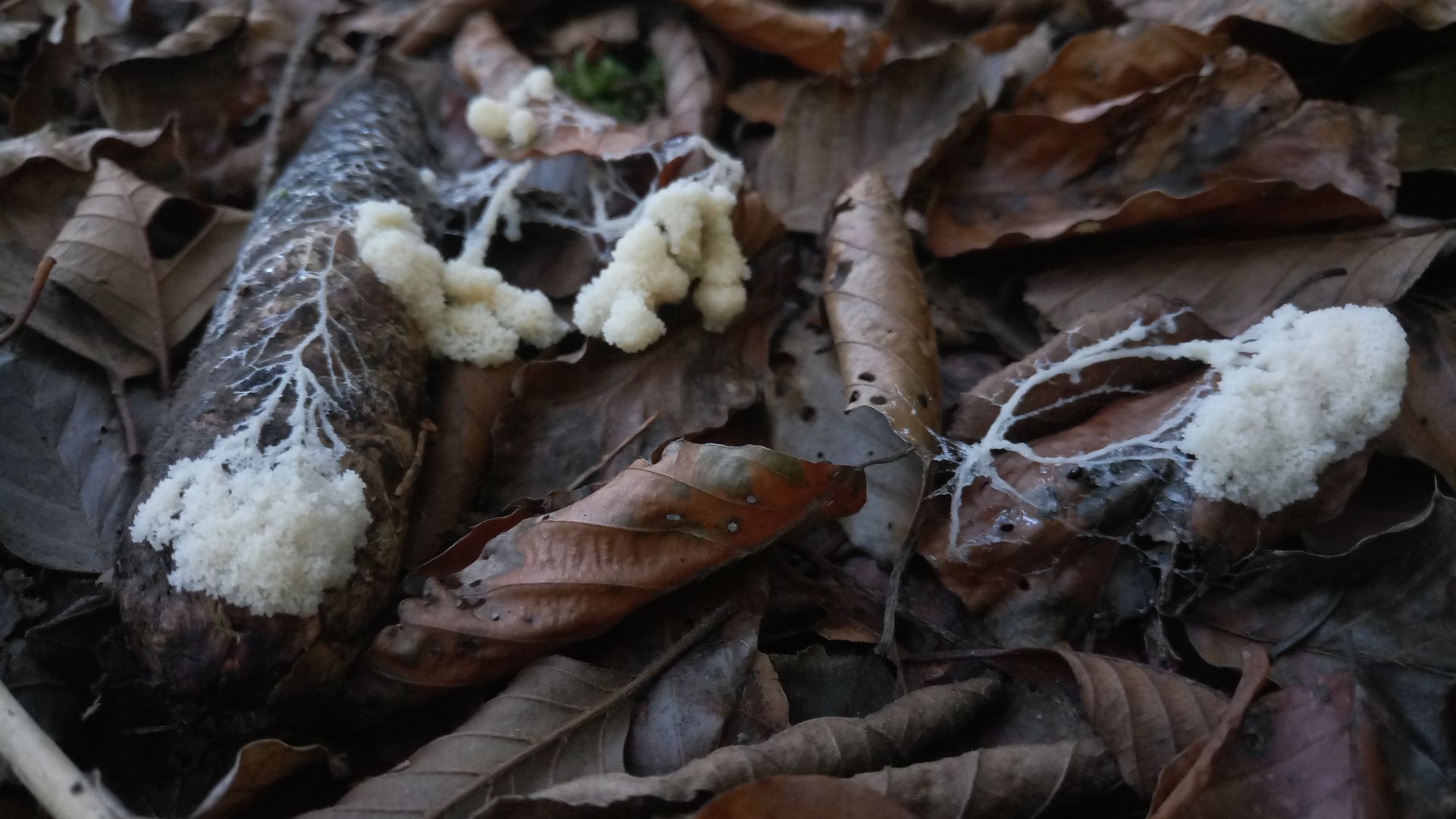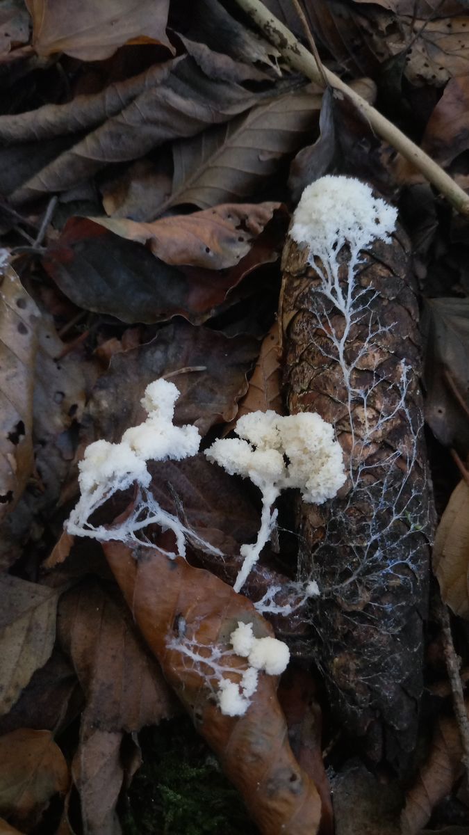 Pilz 3 ist gar keiner;-), da es sich um einen Schleimpilz handelt, der schon ordentlich gewandert ist und wunderbare Spuren hinterlassen hat. Ist das die Weisse Lohblüte (Fuligo candida)?
