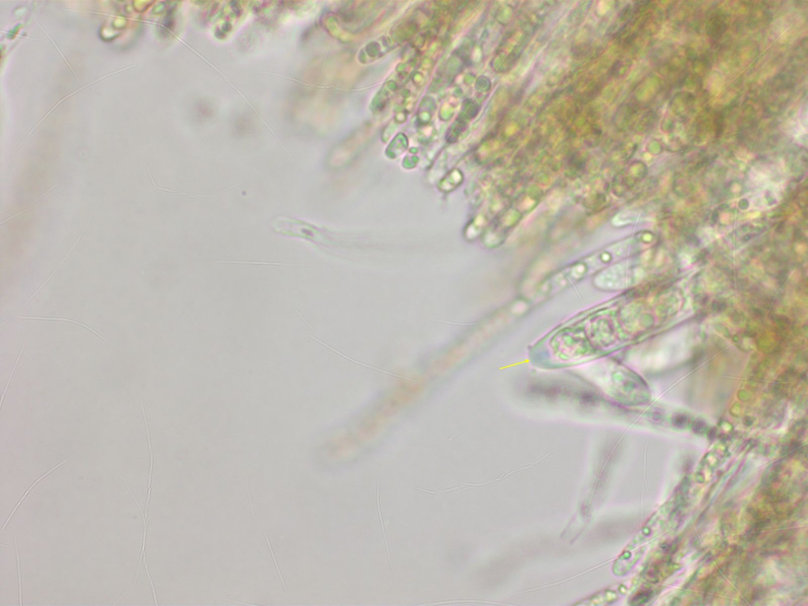 Die Sporen sind sehr lang, um 20 µm, und wurstförmig.