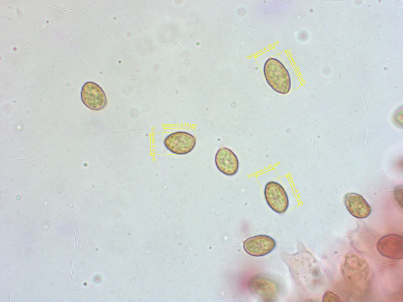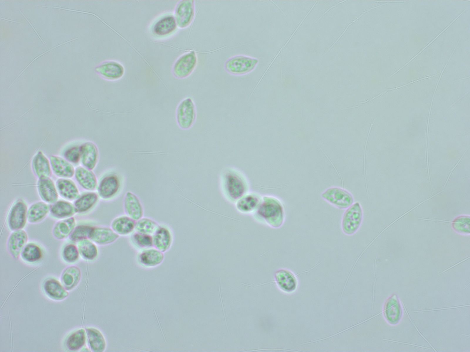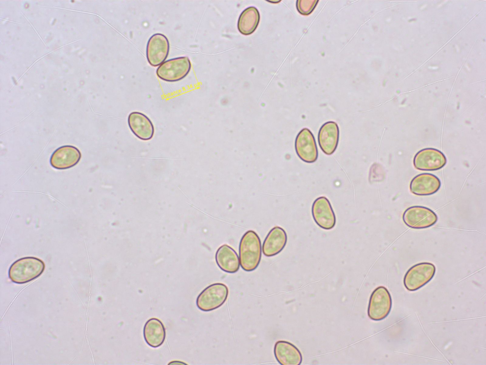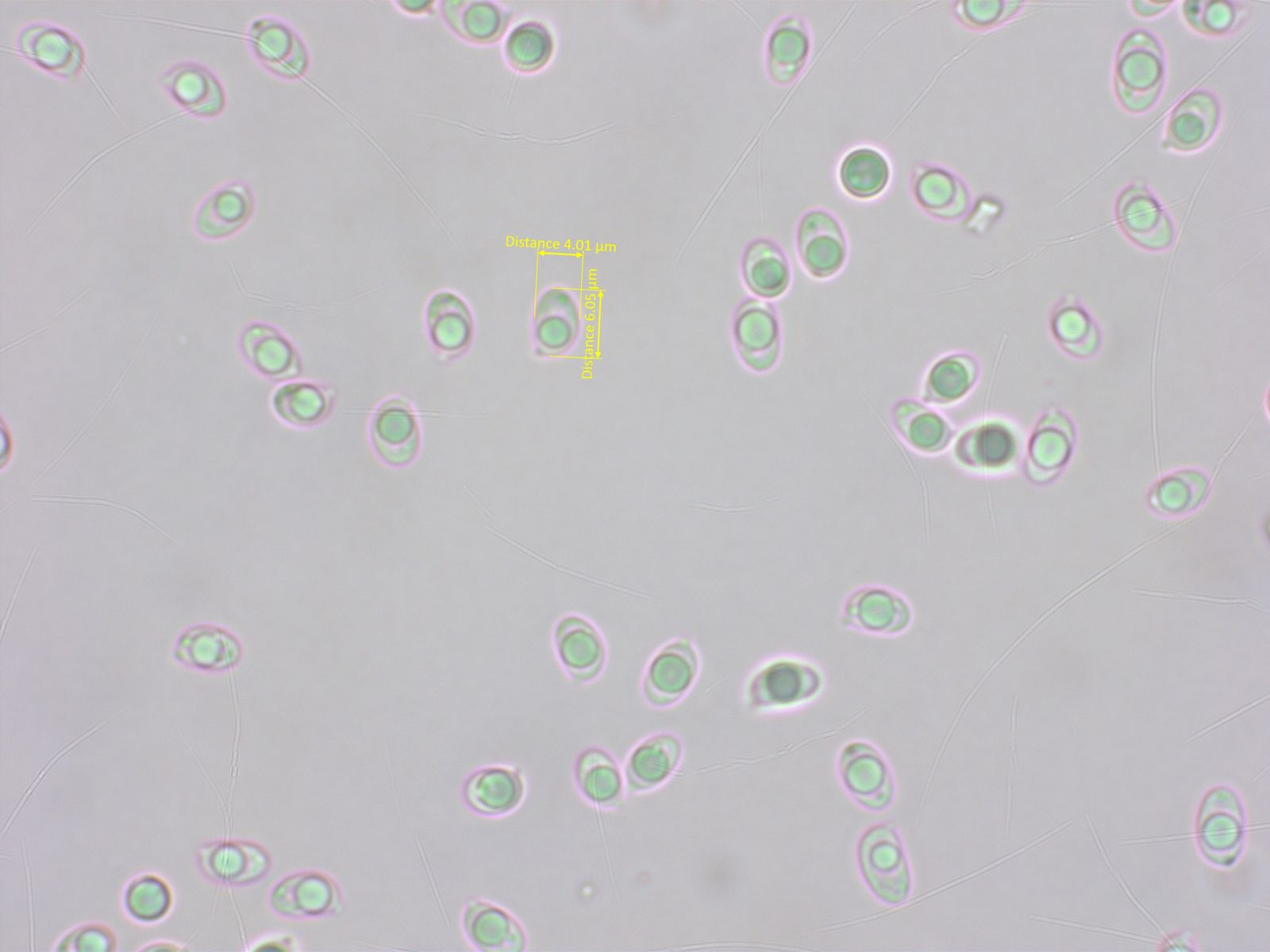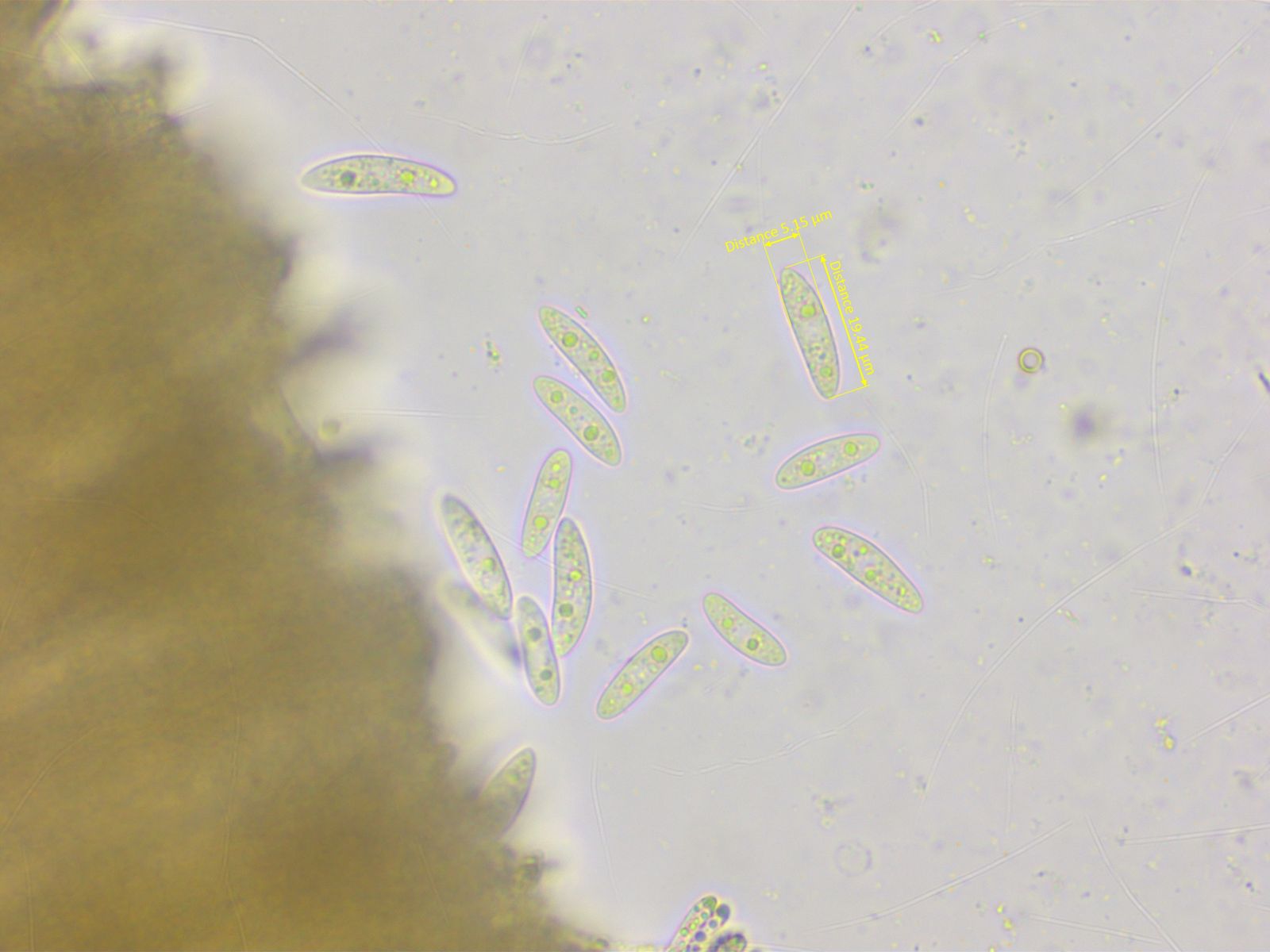 Sporen in Ammoniak mit dem gattungstypischen, lichtbrechenden Tropfen.