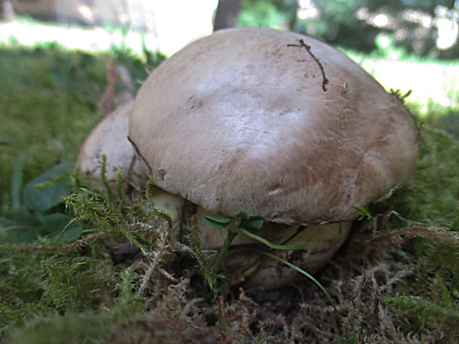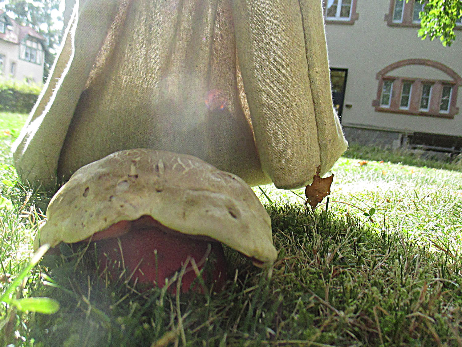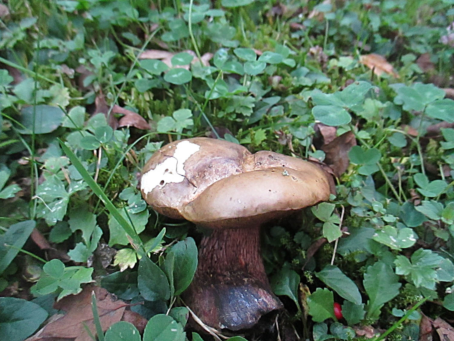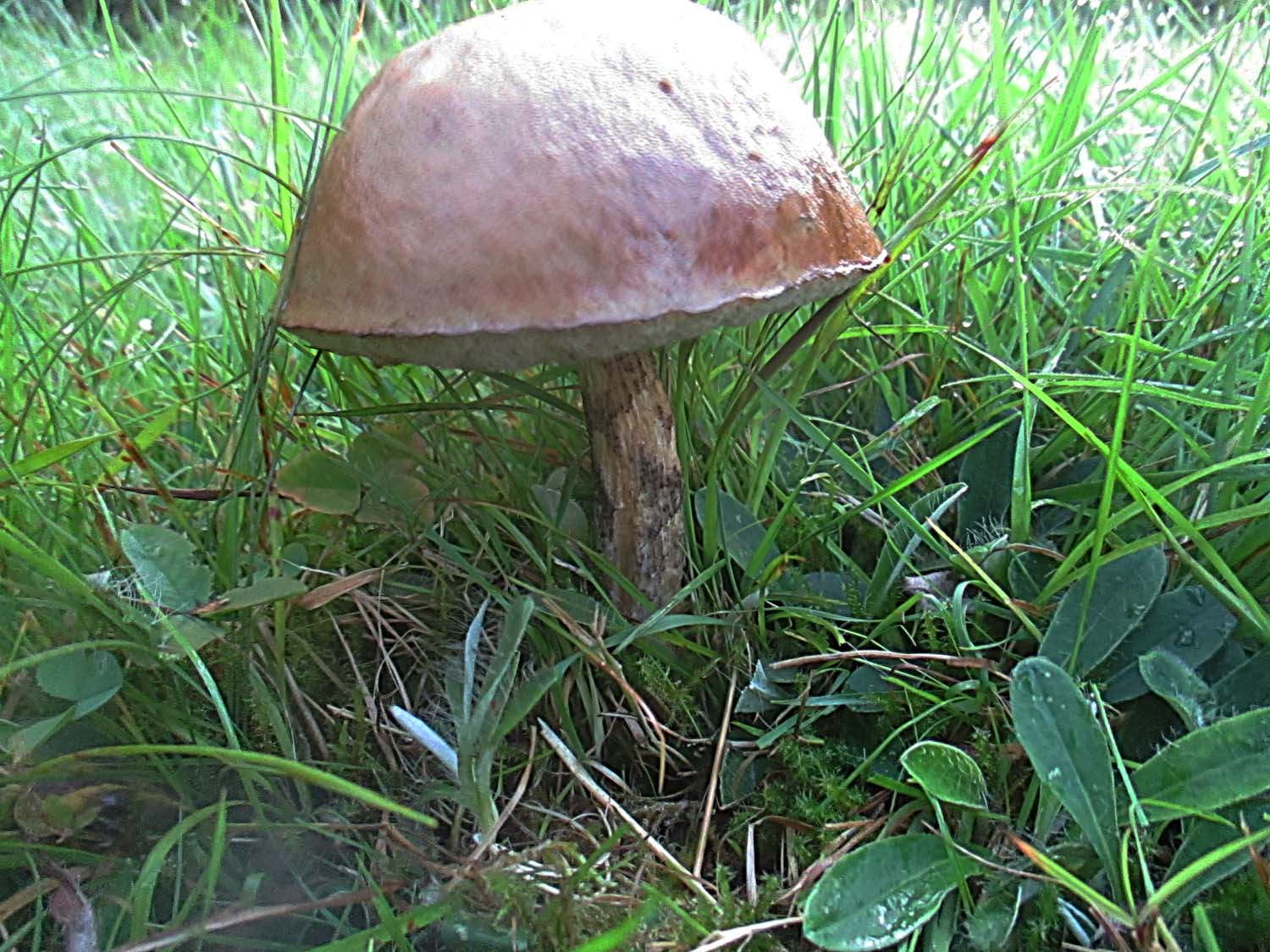 Am Rand eines Magerrasens hat sich ein alter Birkenpilz hervorgetraut.