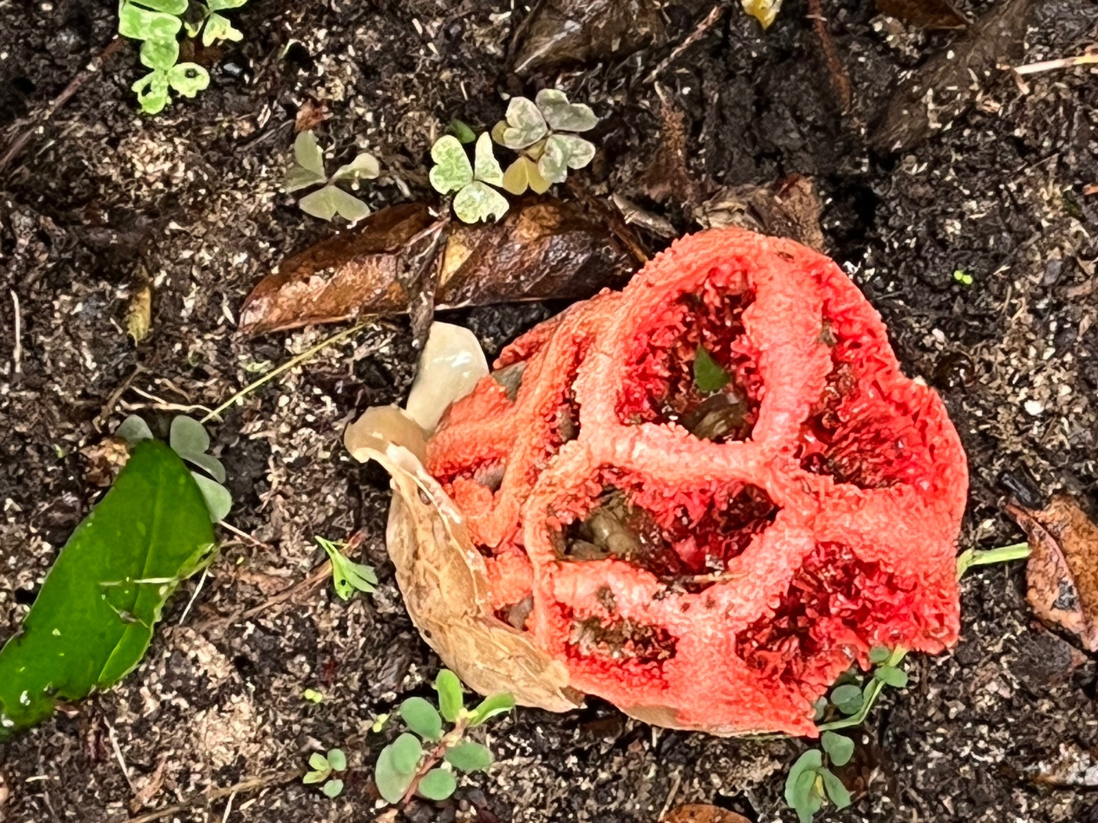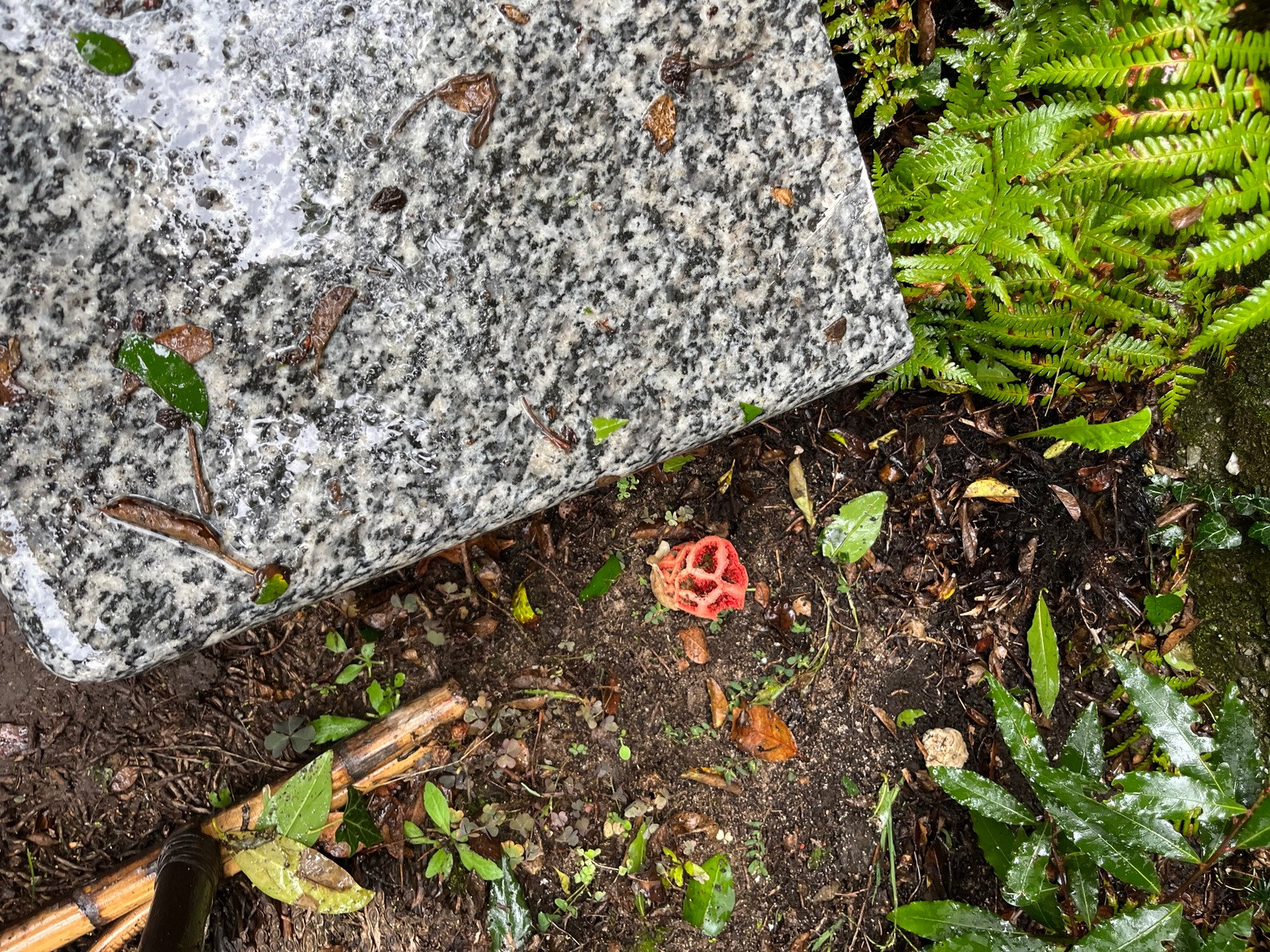 Rotes Gebilde im Garten - etwa ein Pilz?