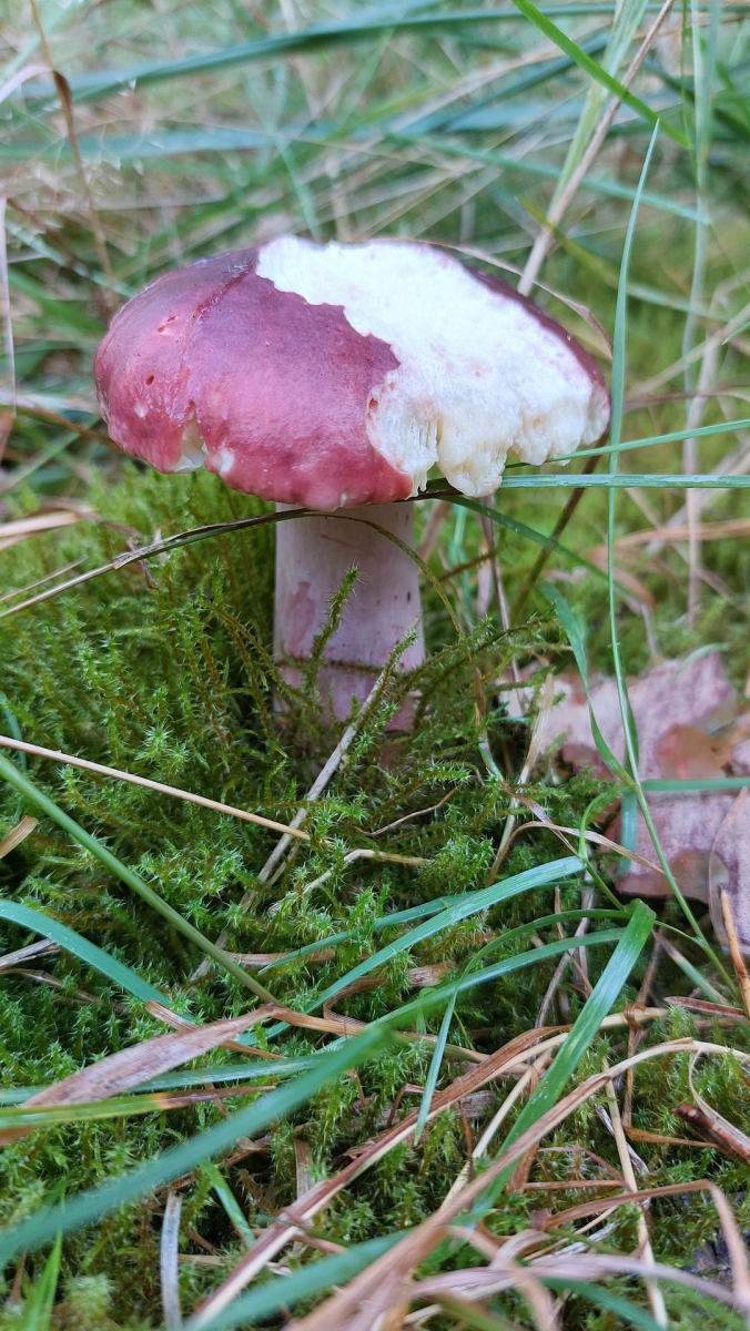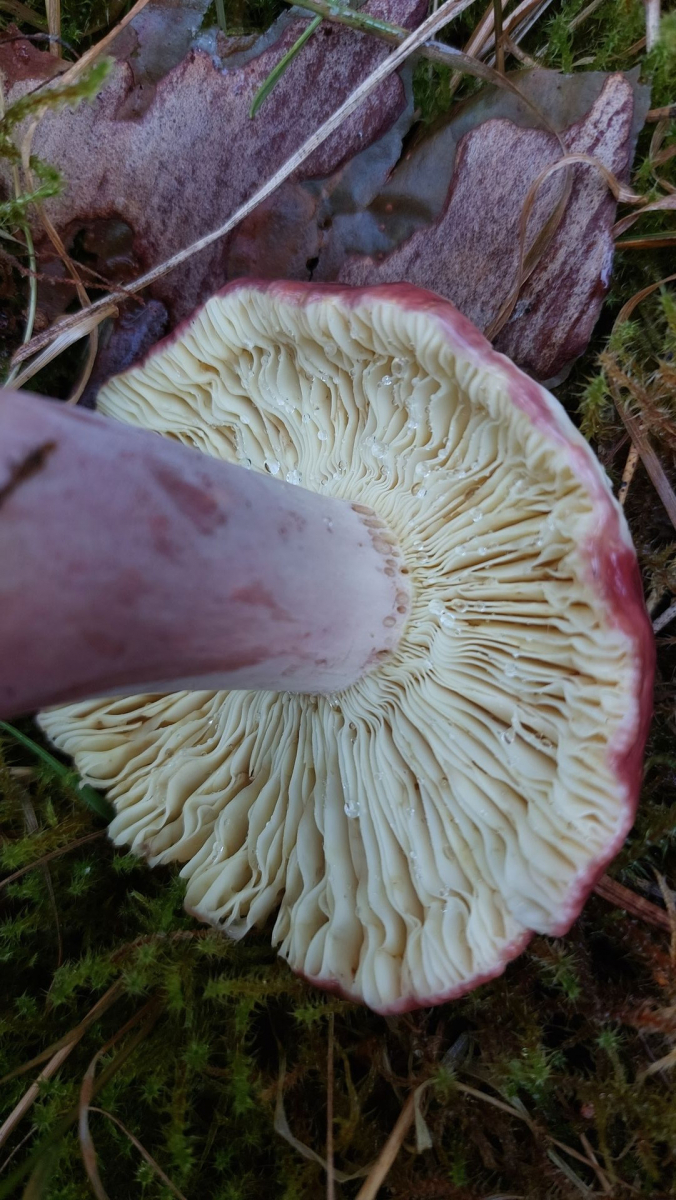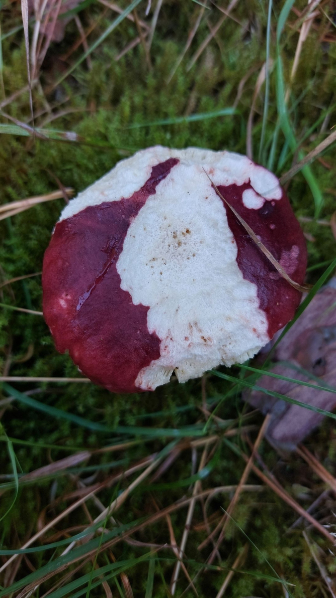 Stachelbeer-Täubling (R. queletii): Huthaut müsste über die Hälfte abziehbar sein, außderdem typischer Fichtenbegleiter.