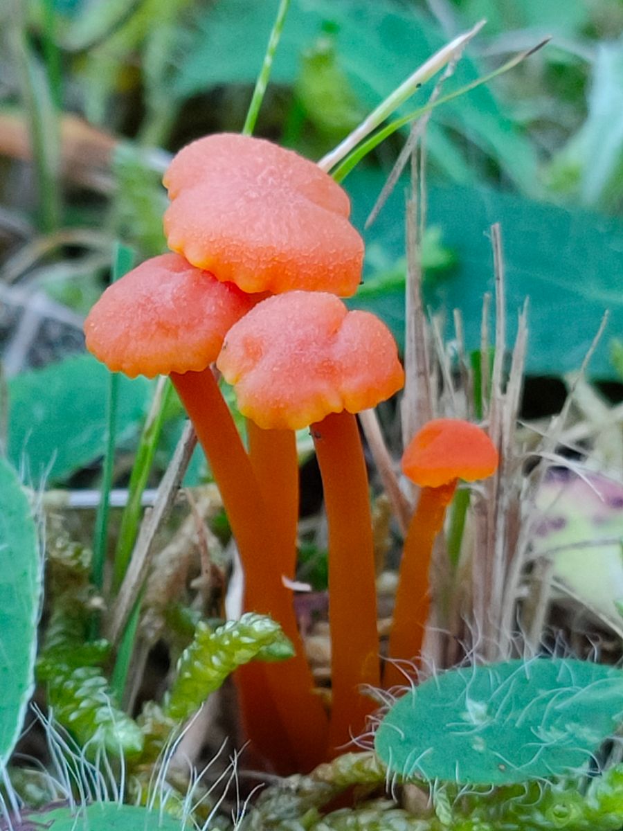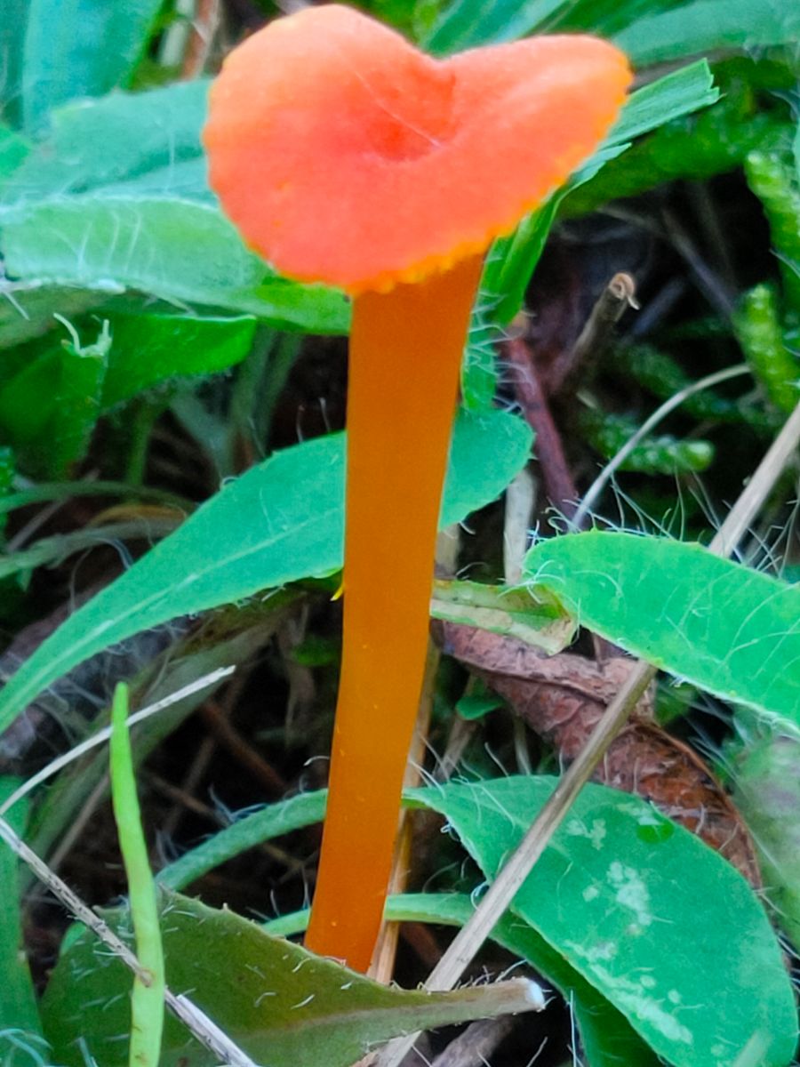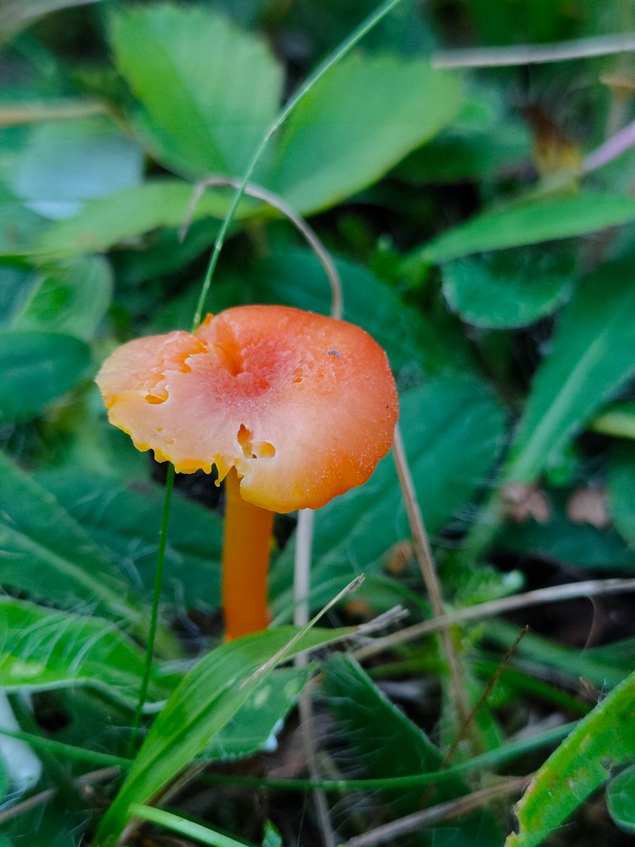 2. Dieser sehr kleine rote Saftling hat keinen auffälligen Geruch, ist wieder mild, hat eine heller gekerbten Hutrand und der Habitus hat deulich herablaufenden Lamellen.