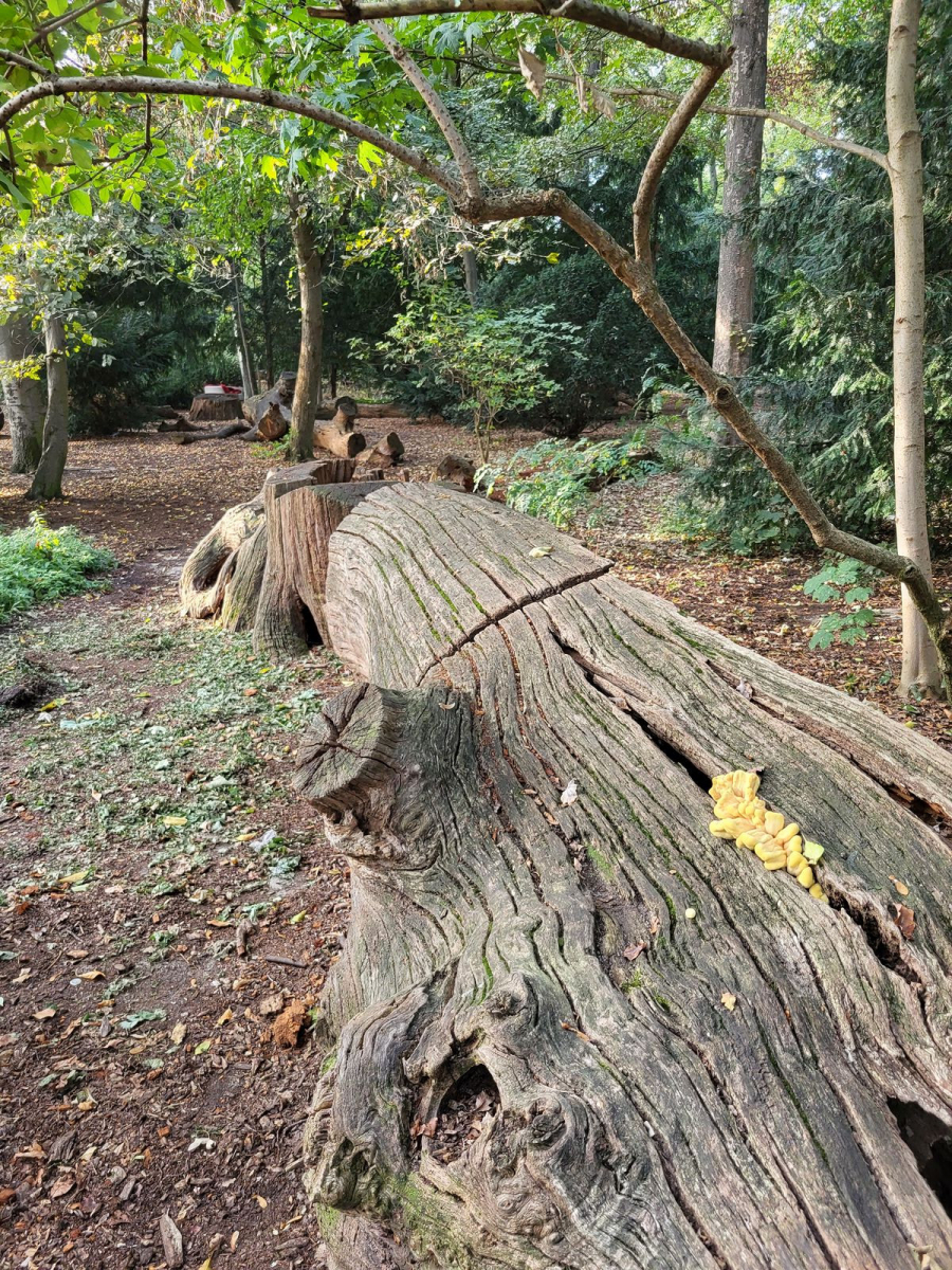 In dem übrig gebliebenen Baumstumpf direkt dahinter waren rote/rosafarbene Fruchtkörper, Baumschwämme.