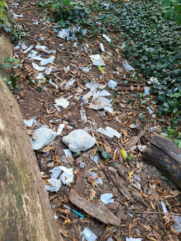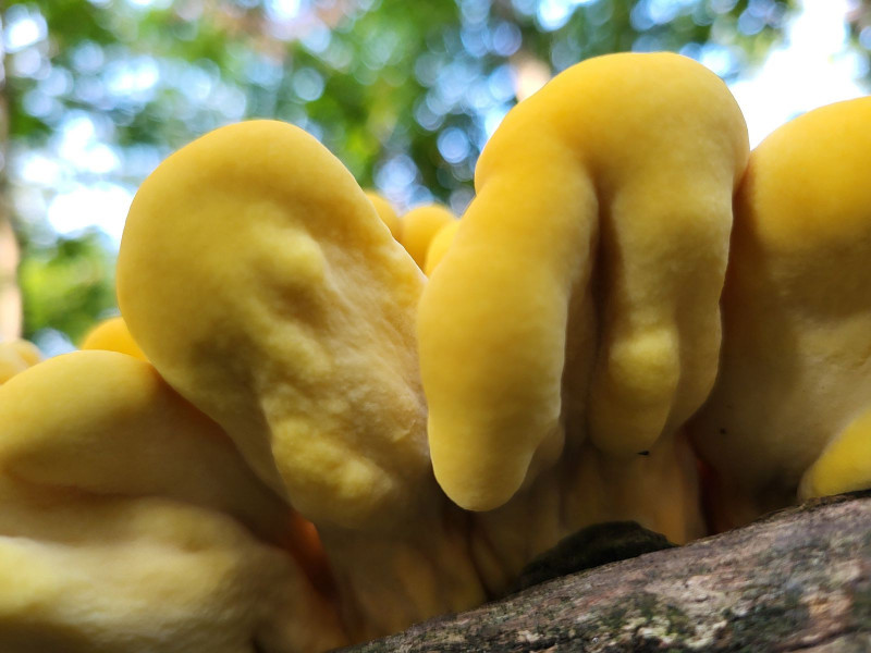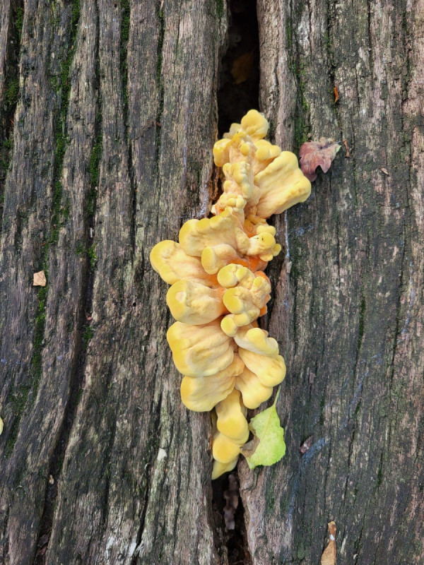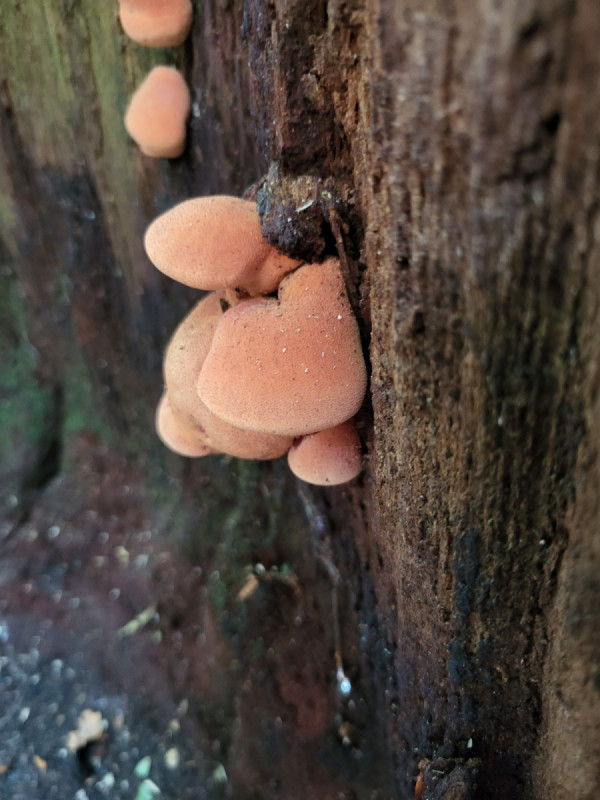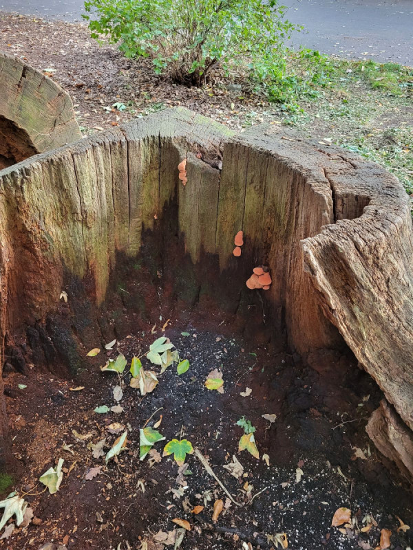 In dem übrig gebliebenen Baumstumpf direkt dahinter waren rote/rosafarbene Fruchtkörper, Baumschwämme.