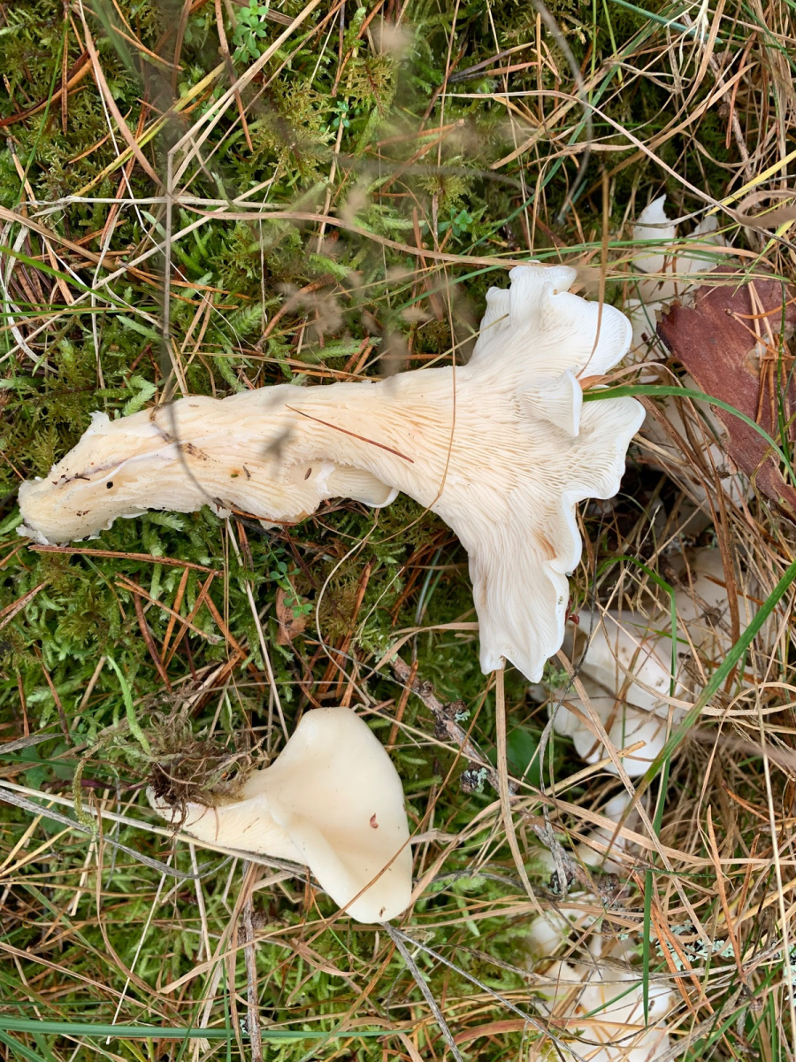 8. Apropos Stubben. Hm. Im Auwald an Laubholz hätte ich die ohne groß zu zögern Pleurotus cornucopioides genannt. Aber mitten im schottischen Kiefernurwald? Die waren sogar nichtmal selten 6 Fundstellen. Geruch leicht nach Anis: