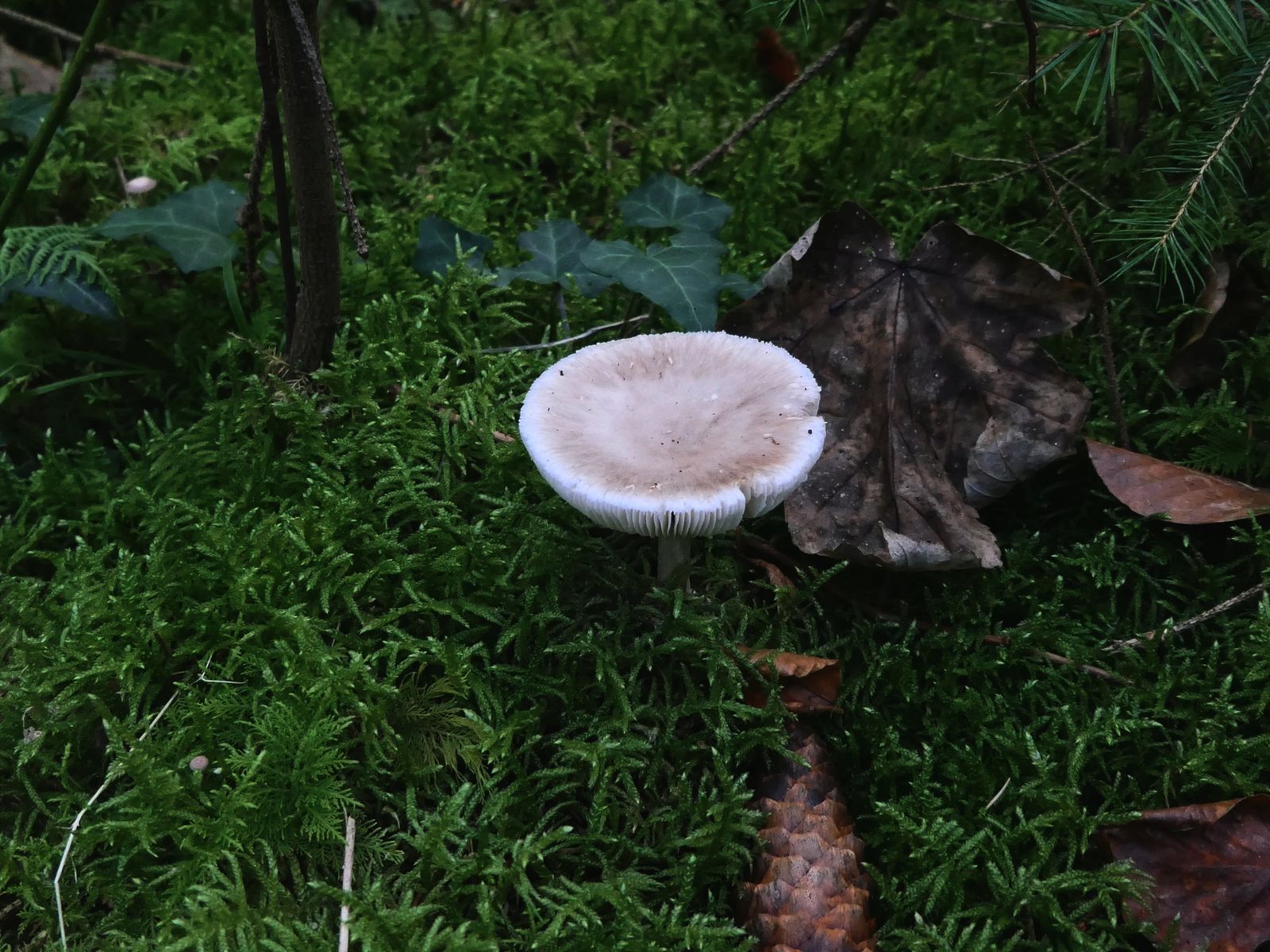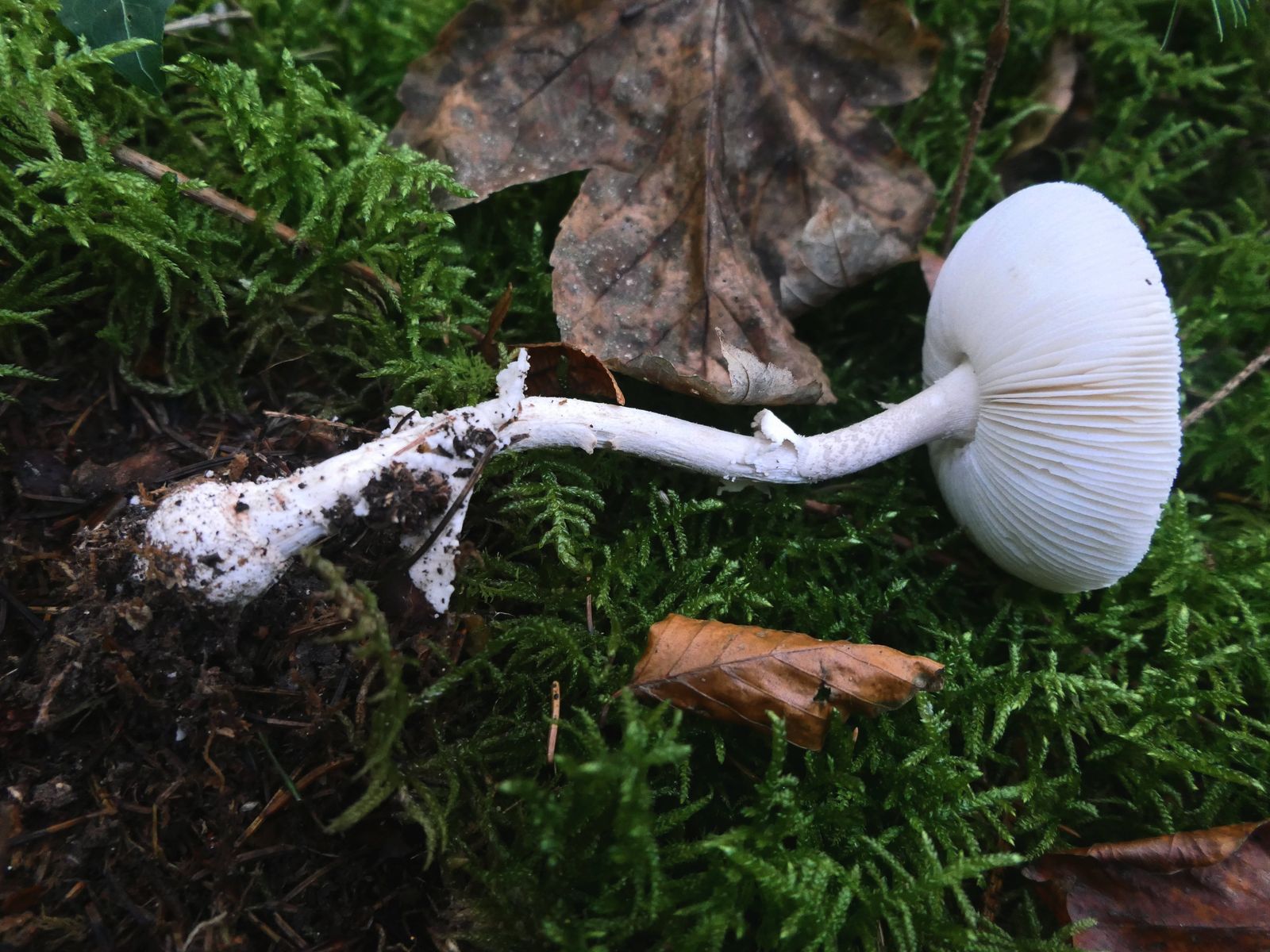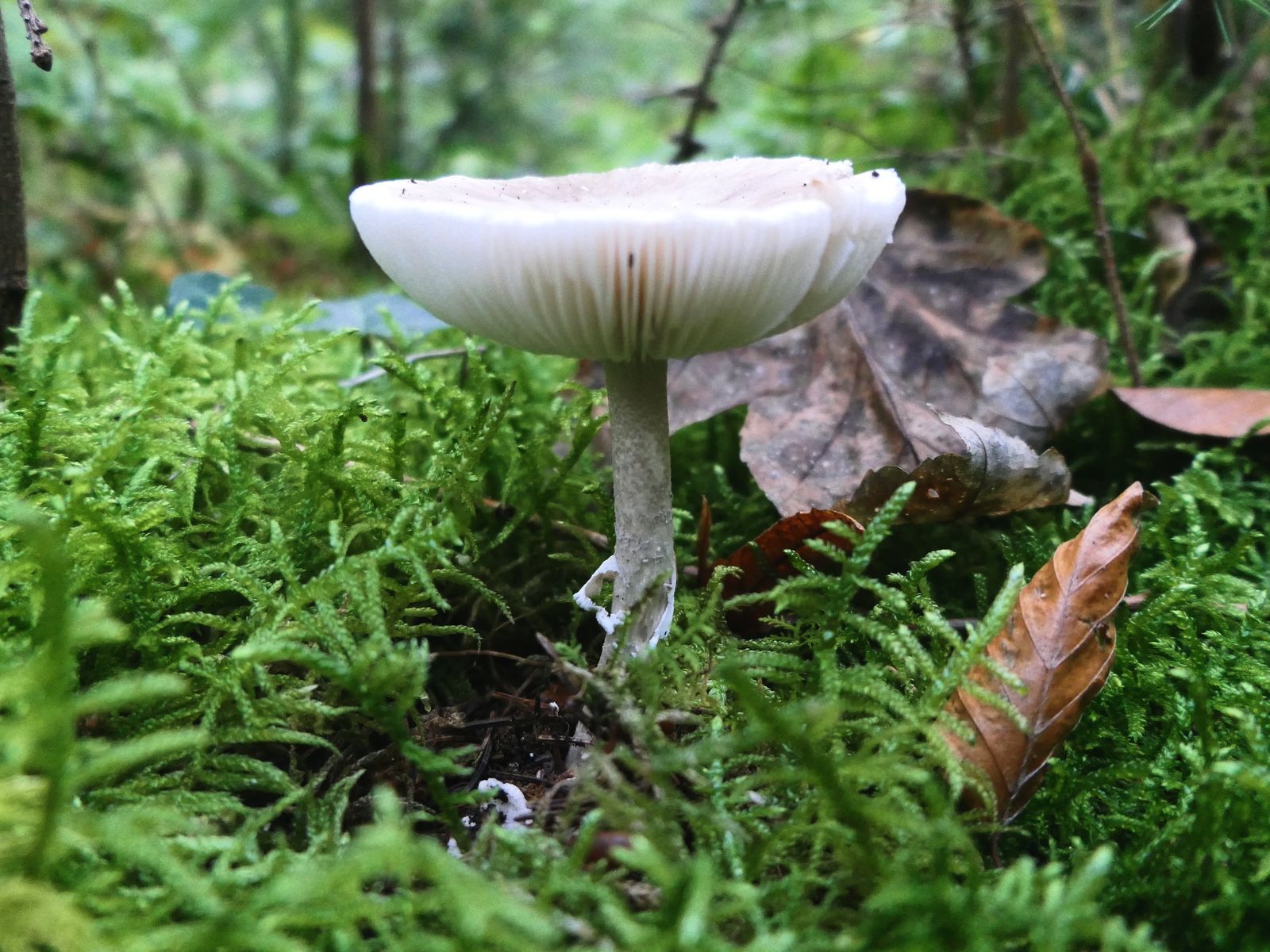Beim Gang durch einen fichtendominierten Waldabschnitt mit moosigem Boden und buschigem Unterwuchs fand ich eine einzelne, ältliche, weißliche Amanita, mit hell bräunlicher Huthaut ohne Schuppung, die ich zum Bestimmen mitnahm.