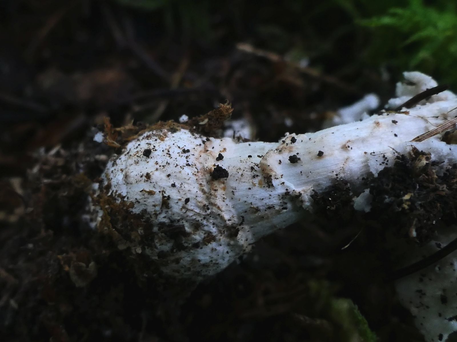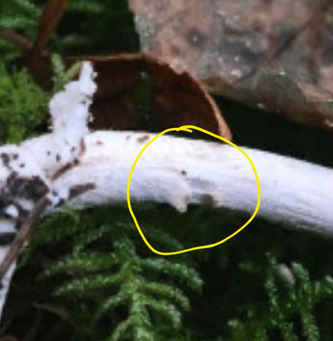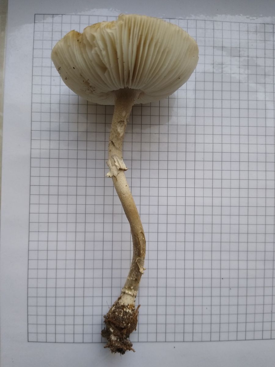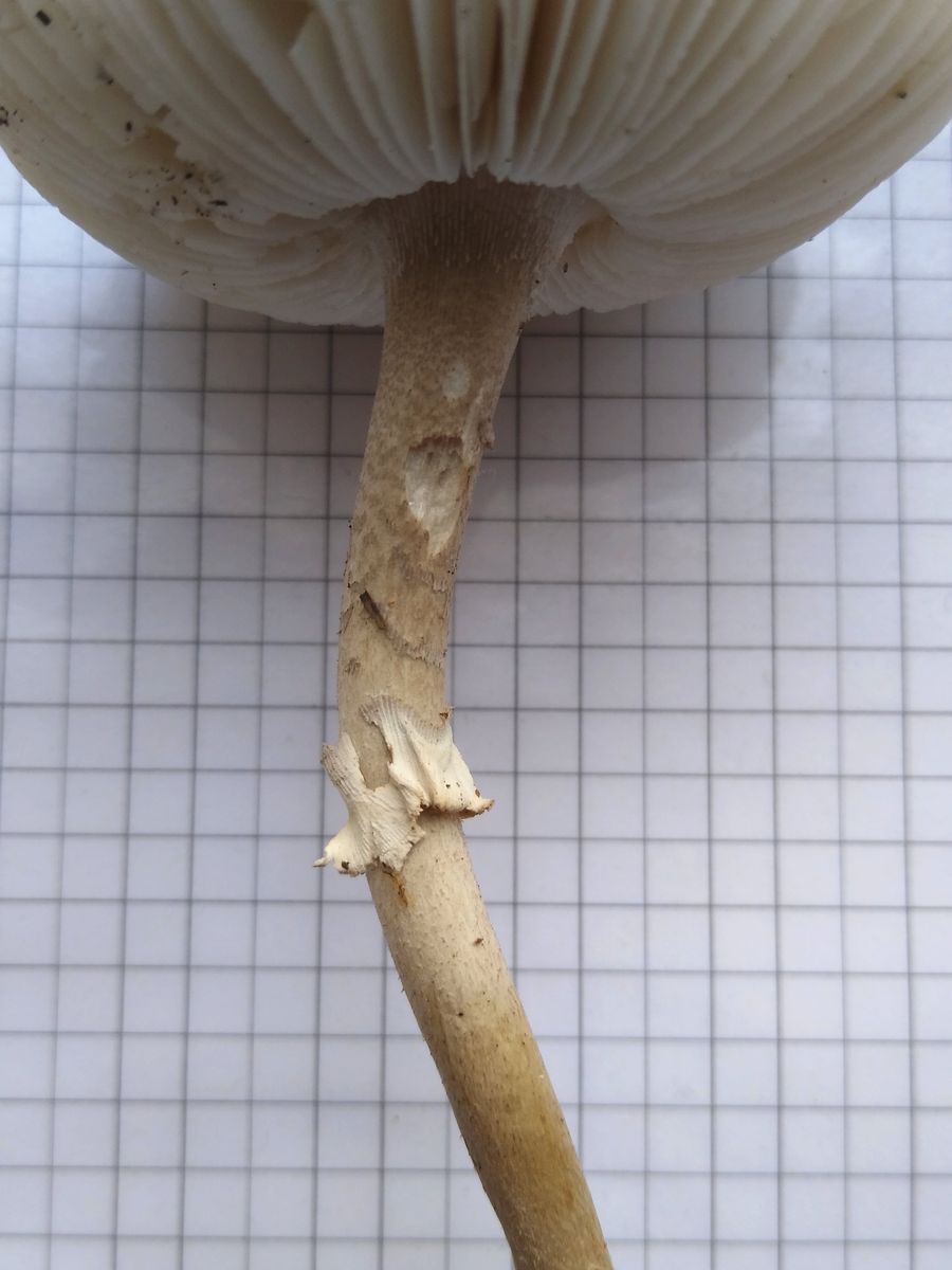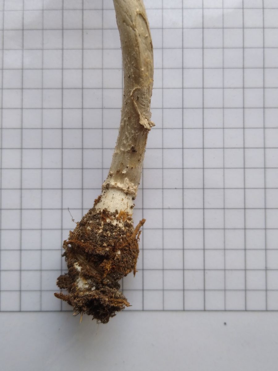 Beim Haraushebeln aus dem Untergrund tauchen lappige weiße Häute auf, die ich erst für Fetzen eine Volva hielt, aber ev. doch zum Ring gehören.