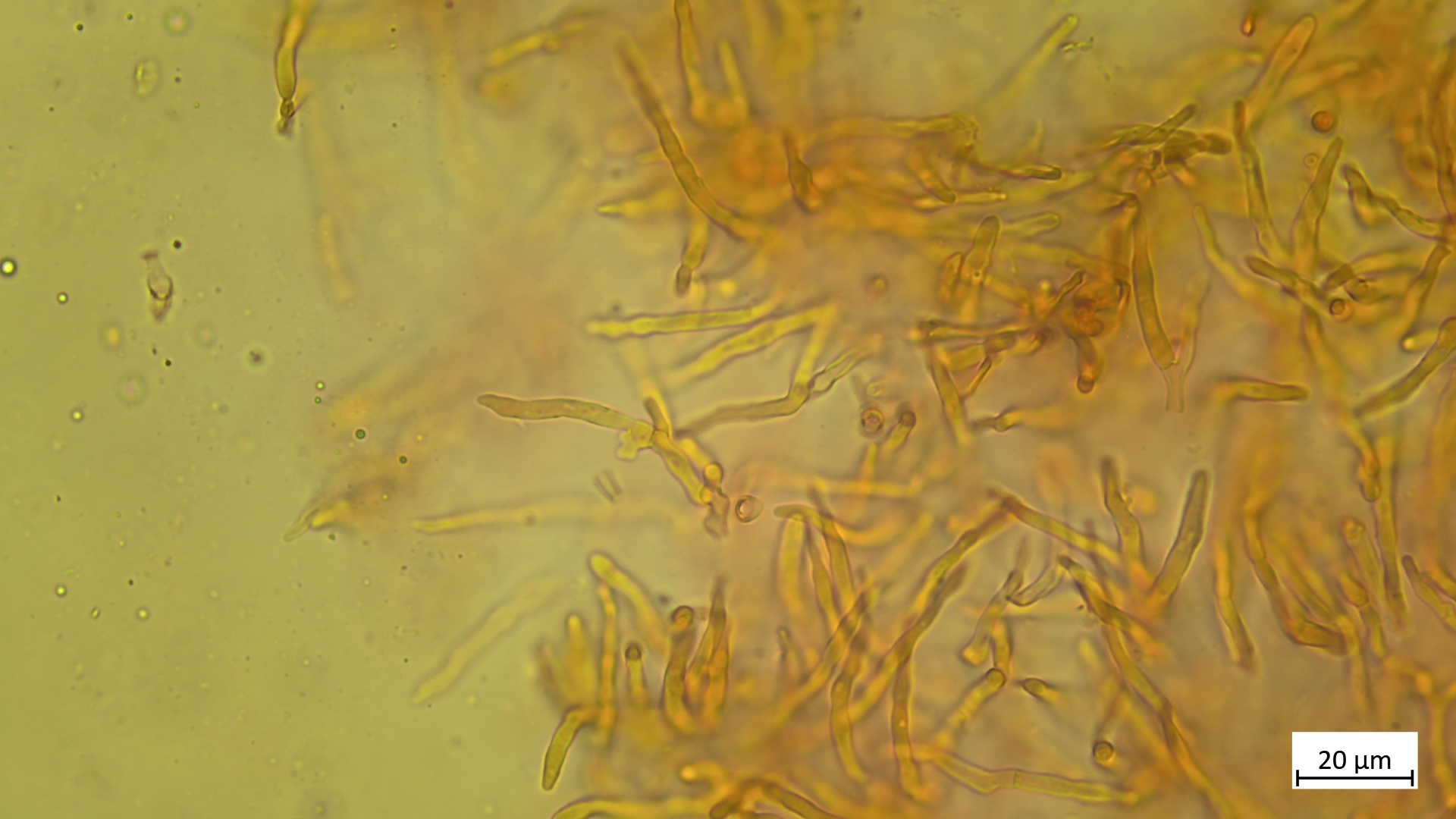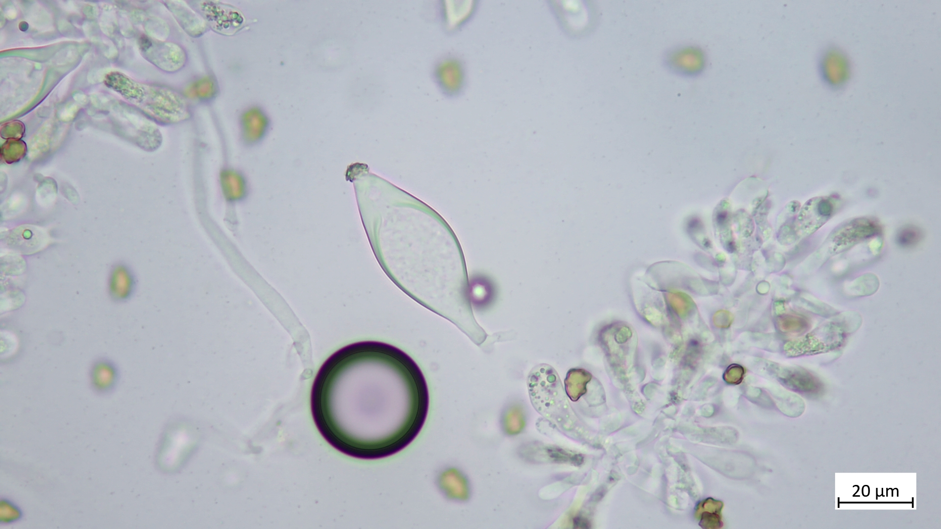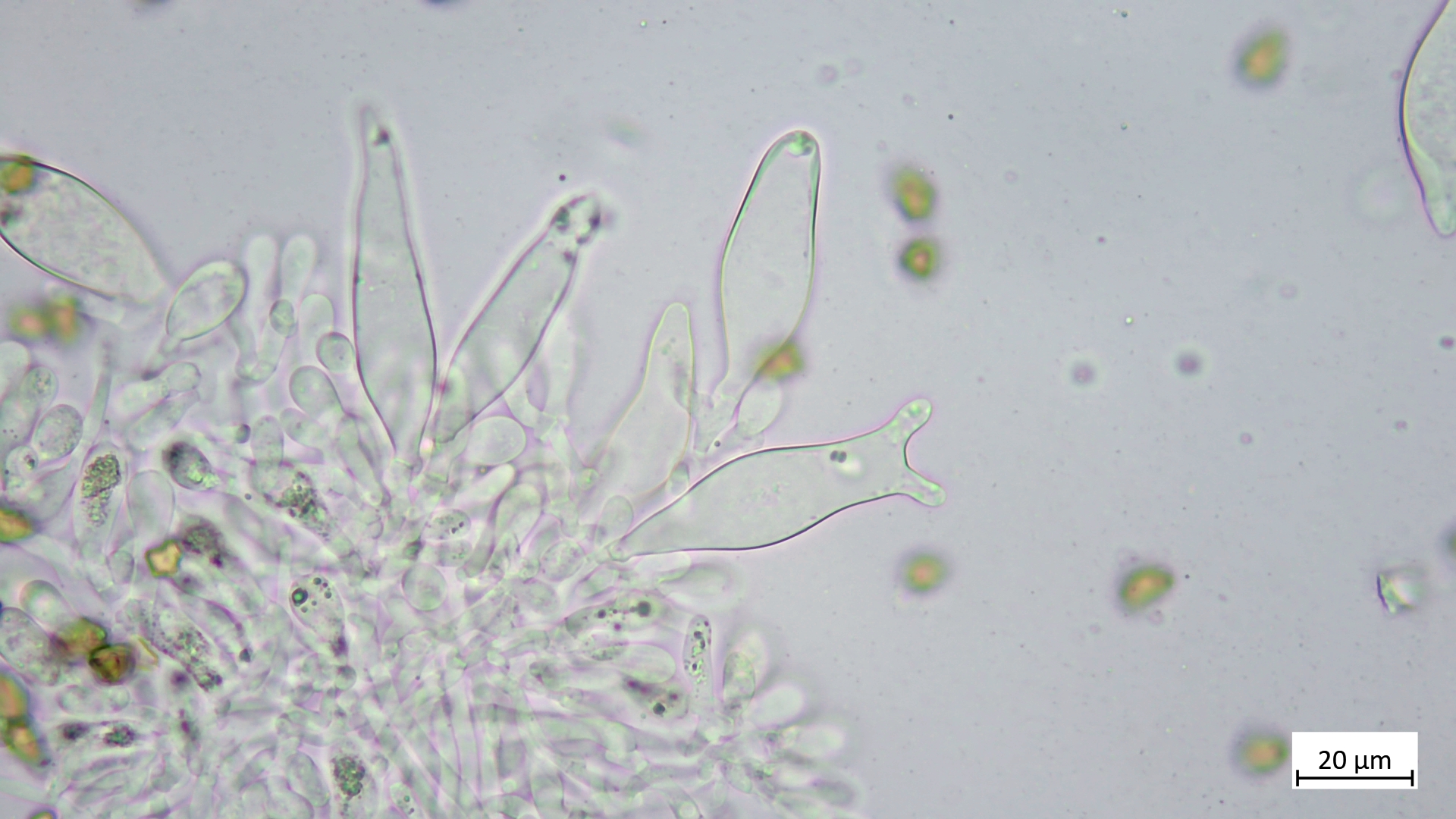 Kaulozystiden oft eher schlank-zylindrisch, lang. Ebenfalls mit Kristallschopf anzutreffen