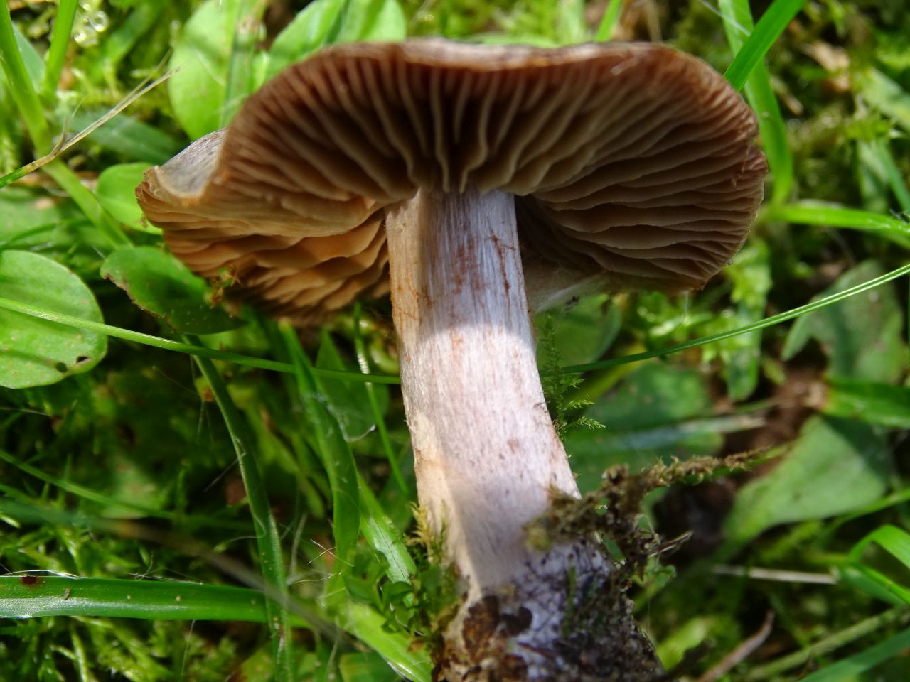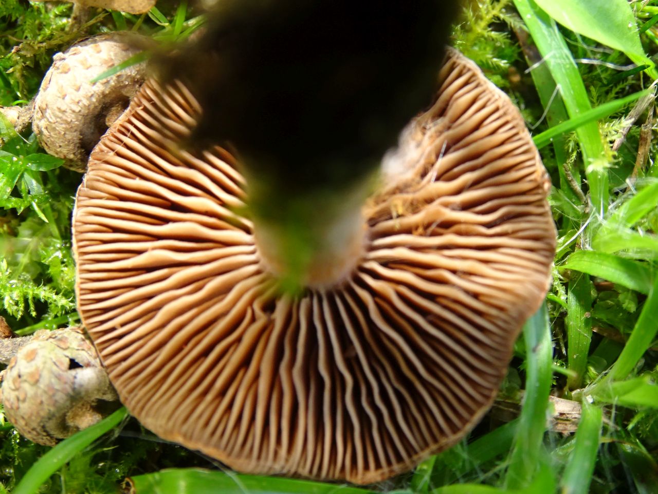 • Der Fund ist von Mitte September auf einem Hamburger Friedhof, direkt neben einer Marmor-Grabplatte - kein Baum in der Nähe. Der Hut-Durchmesser 3cm, Stiel 3 x 0.4, die Oberfläche fein filzig, der Rand mit feinen weißen Velumresten. Das Trama ist im Hut fast häutig dünn, im Stiel weiß, verfärbt sich bes. in Stielrinde lila-braun. Die Sporen sind ellipsoid, uneben (niedrig warzig?), 6x4 µ groß. Die Huthaut besteht aus (häufig inkrustierten) Hyphen mit Schallen und polyedrischen Zellen. Geruch süßlich.
