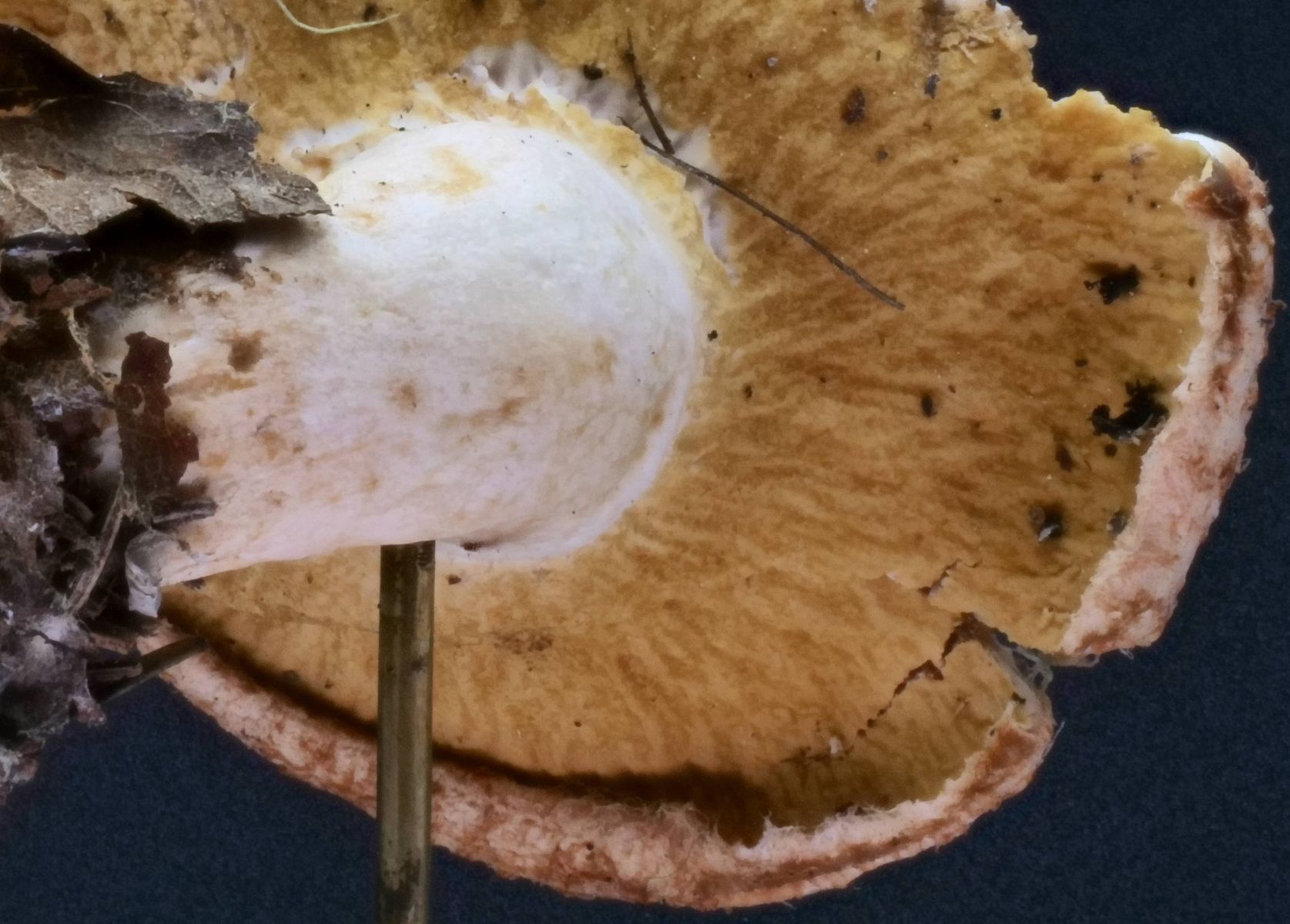 Die Lamellen sind fast flächig bewachsen. Die Farbe ist ein Braun mit leichten Orangeton.