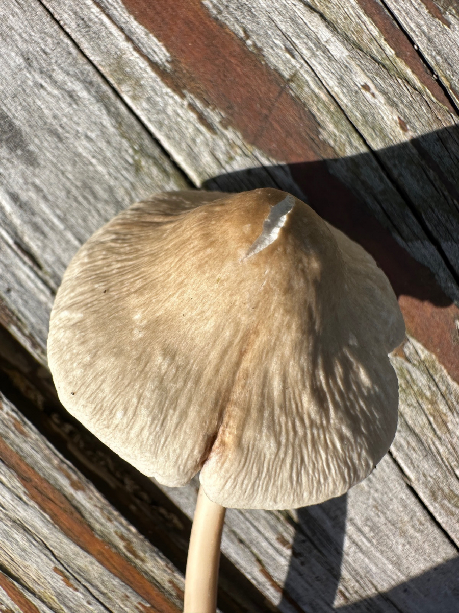 Rosablättriger Helmling – Wikipediade.wikipedia.orgZitatDie für die Gattung großen und kräftigen Fruchtkörper wachsen meist büschelig auf Holz und haben einen 2–6 (–8) cm breiten Hut. Dieser ist jung kegelig-glockig, später gewölbt, aber nie ganz aufgeschirmt. Am Hutscheitel hat er einen breiten Buckel. Die kahle und matte Oberfläche ist bis zum Buckel radial gerieft oder gefurcht. Der Hut ist hellbräunlich, blass graubräunlich bis weißlich, der Rand ist heller, der Buckel etwas dunkler gefärbt.