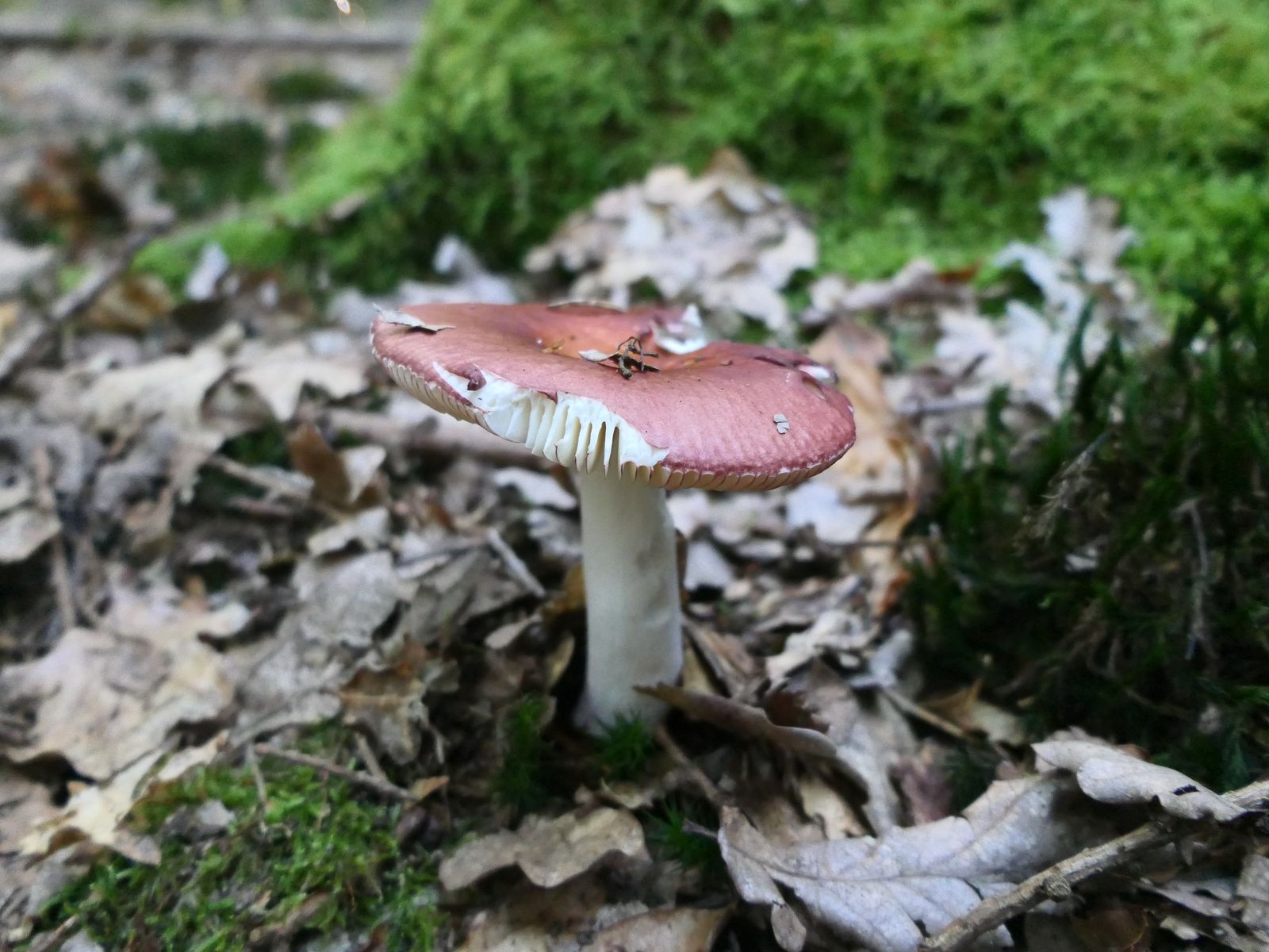 Ein paar Meter weiter finde ich ein Einzelexemplar eines frisch umgestoßenen Pilzes, eine Russula mit schwarz-violetter Huthaut.