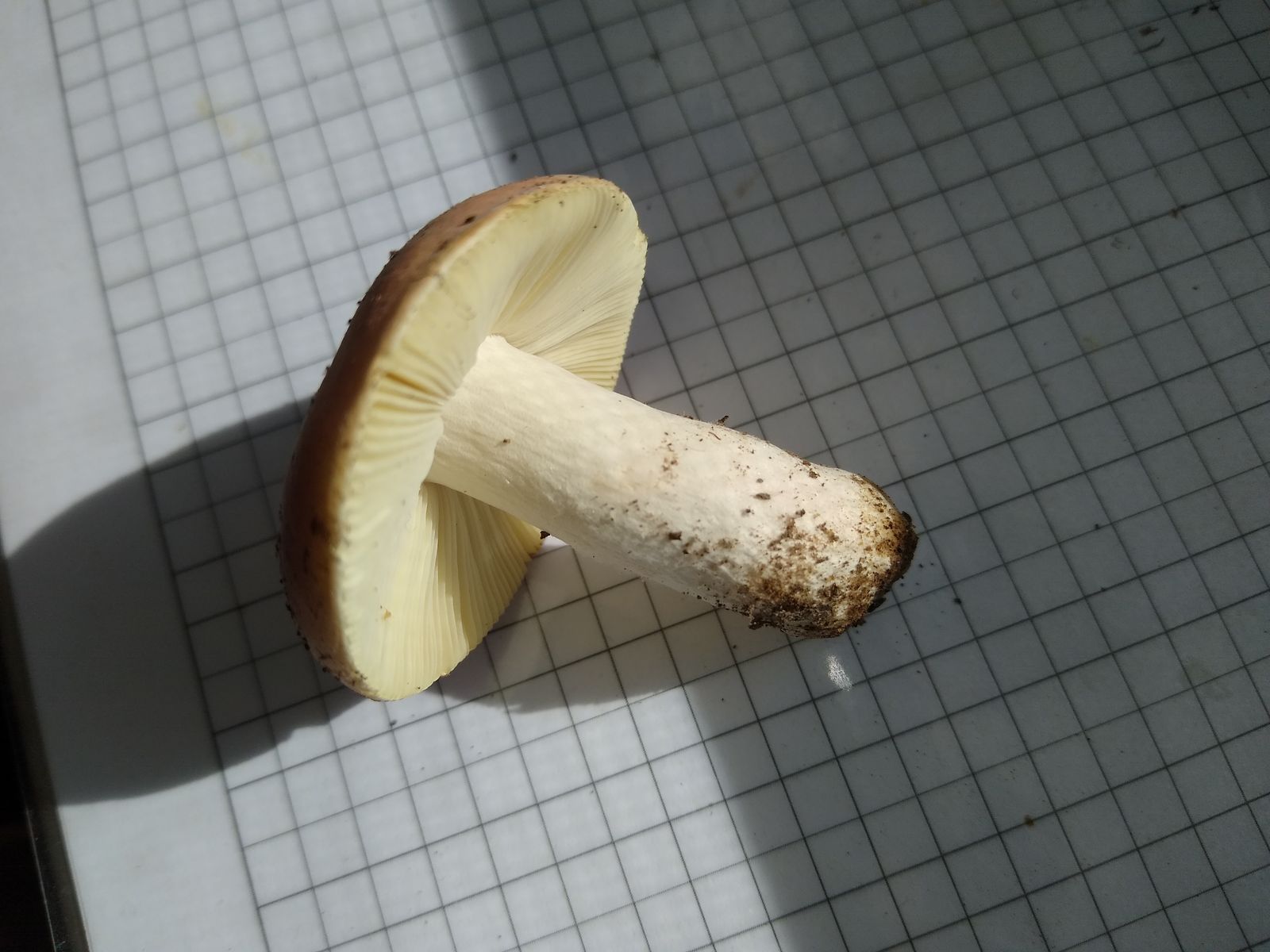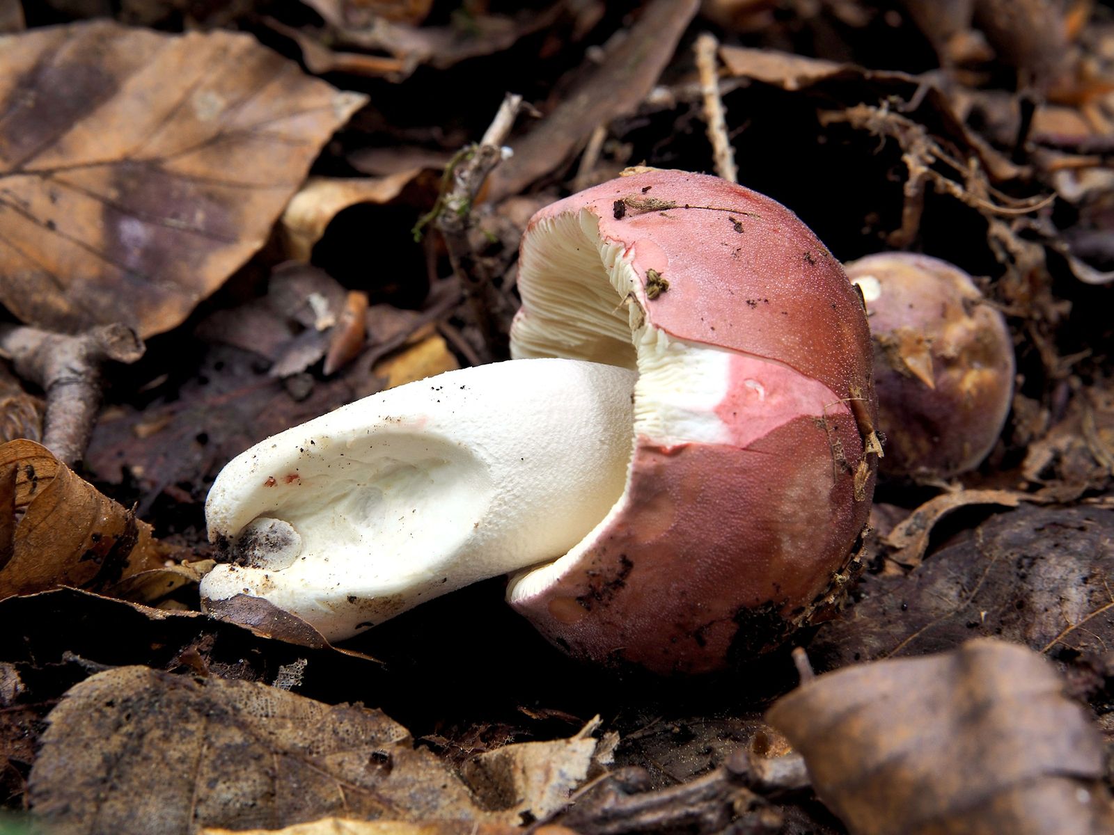 Bild I2 Huthaut dunkelviolett, Fraßstellen violett, Lamellen cremeweiß und spröde, Huthaut dreckverklebt