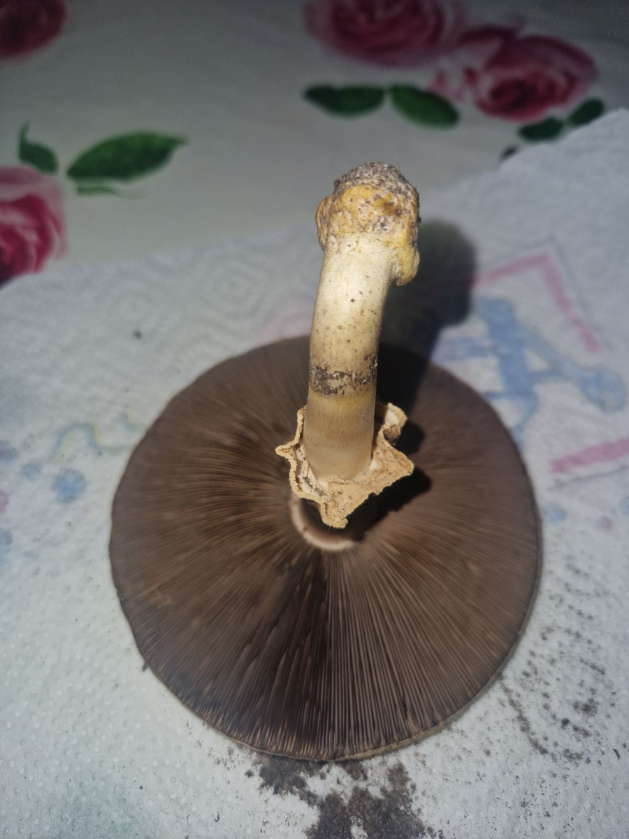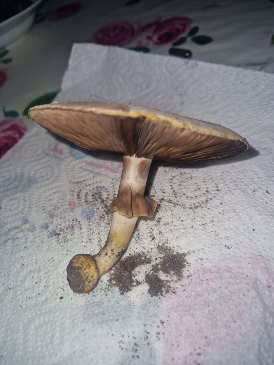 Ich habe in einem Garten mehrere solchen Pilze mit braunen Lamellen gefunden. Alle haben einen Flockigen Hut und die Stielbasis ist knollenförmig und gelblich verfärbt. An den Lamellen riecht er nur angenehm pilzig, am Stiel etwas strenger. Ich kann den Geruch allerdings nicht gut zuordnen.