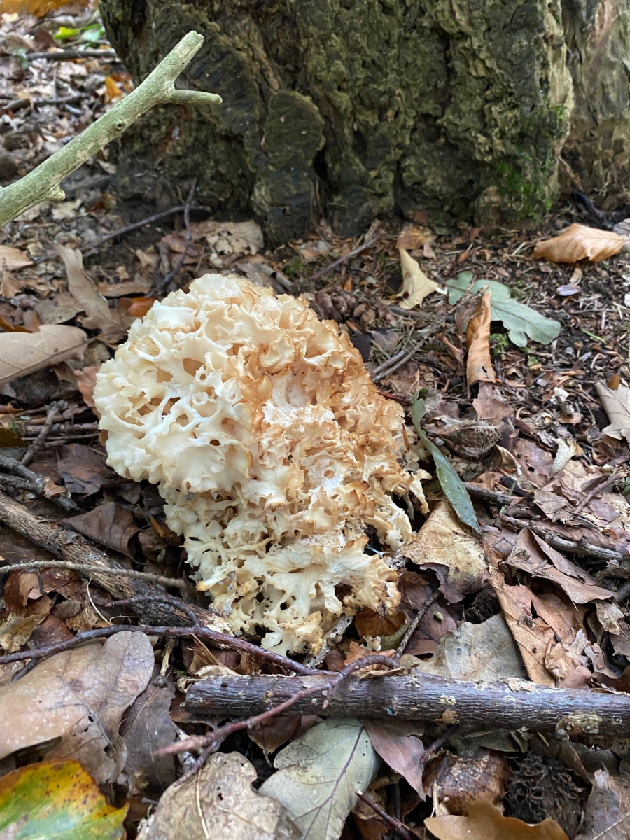 das ist eine Krause Glucke und der dahzugehörige Baum dĂŒrfte irgendeine Kiefer sein, an der dieser Pilz wĂ€chst. Ein solches Teil habe ich heute auch gesehen aber nicht mitgenommen.