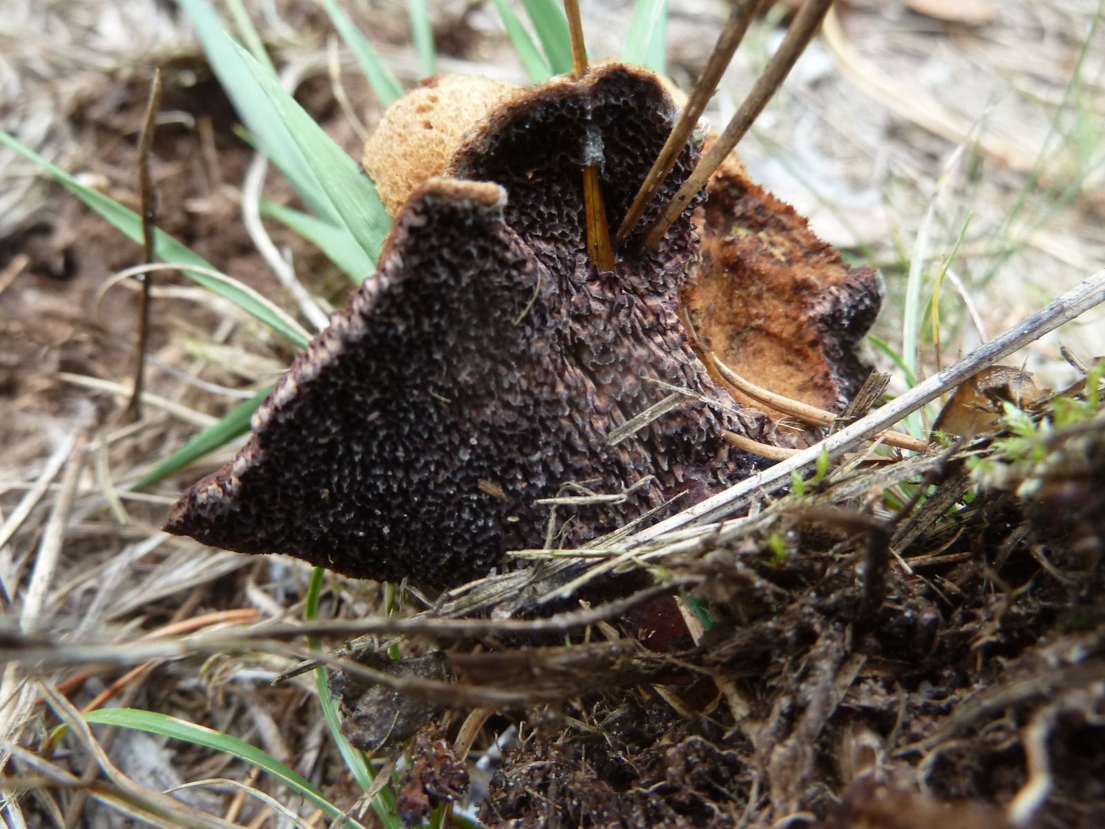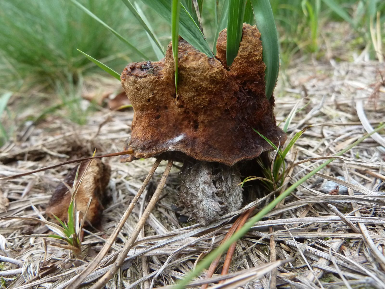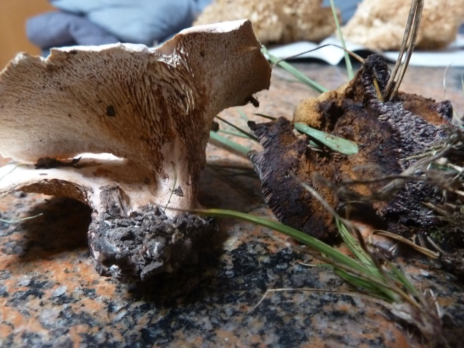 Heute habe ich auf einem Rückeweg im Mischwald dieses komische Gebilde entdeckt, was ich zunächst überhaupt nicht einordnen konnte. Kein Holz im Boden feststellbar, aber feine Baumwurzeln. Könnte das ein ganz junger Kiefern-Braunporling sein, der durch seinen Standort mehrere Meter von der nächsten Kiefer entfernt getarnt ist? Konsistenz ist relativ weich, letztes Foto ist Schnittbild.