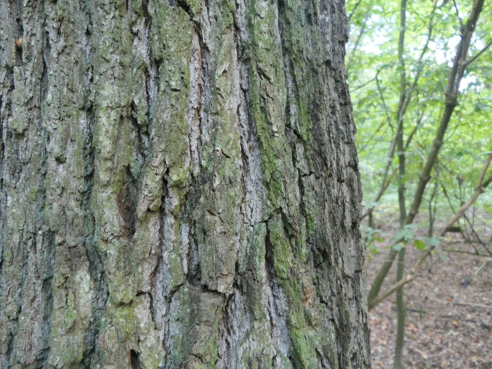 In einem lichten Abschnitt eines Eichen-Hainbuchen-Rotbuchenwald, auf kalkhaltigem Boden am mittleren Neckar hier bei mir in der Nähe, steht eine Eiche mit weißlicher Borke.