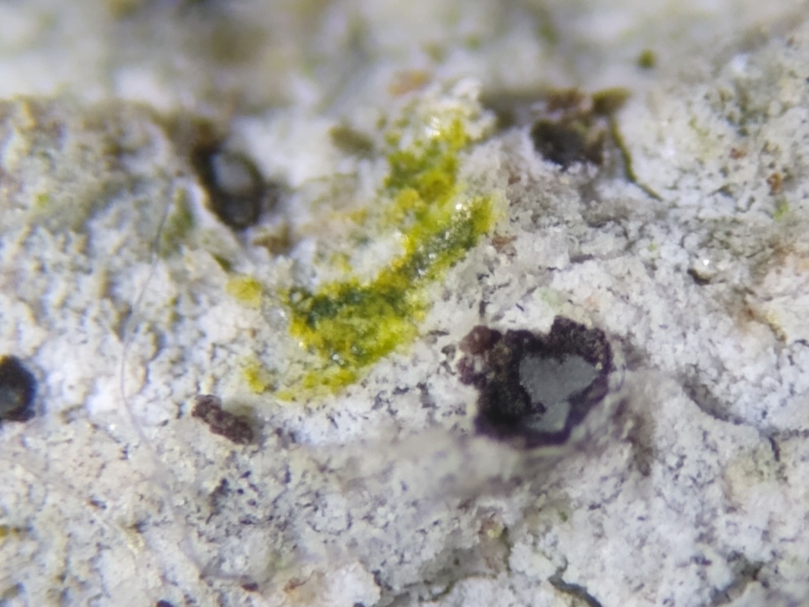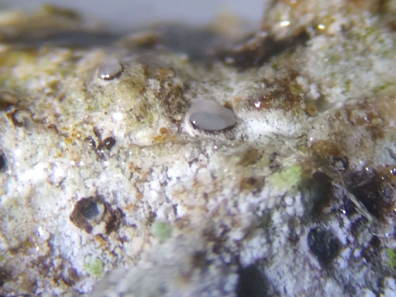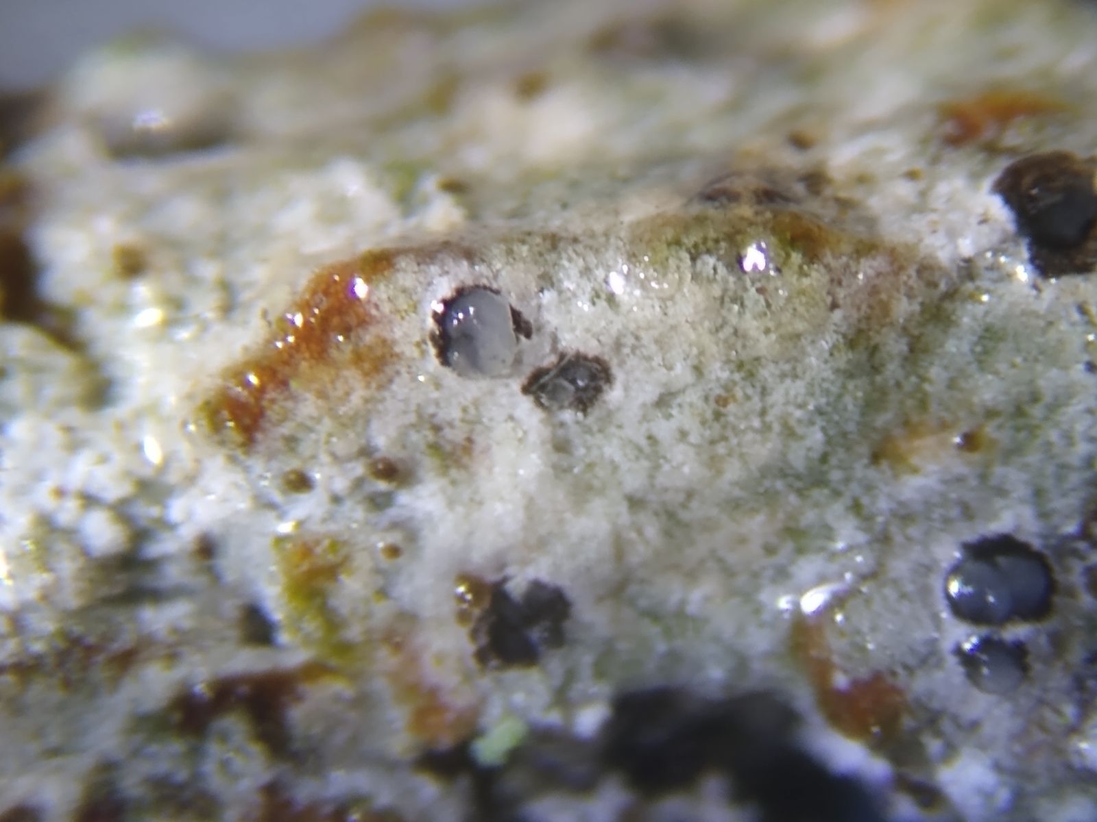 Bild 3 Trockener, weißlicher, rissiger Thallus mit bräunlichen Flecken und dunklen Pyknidien unter der Streolupe