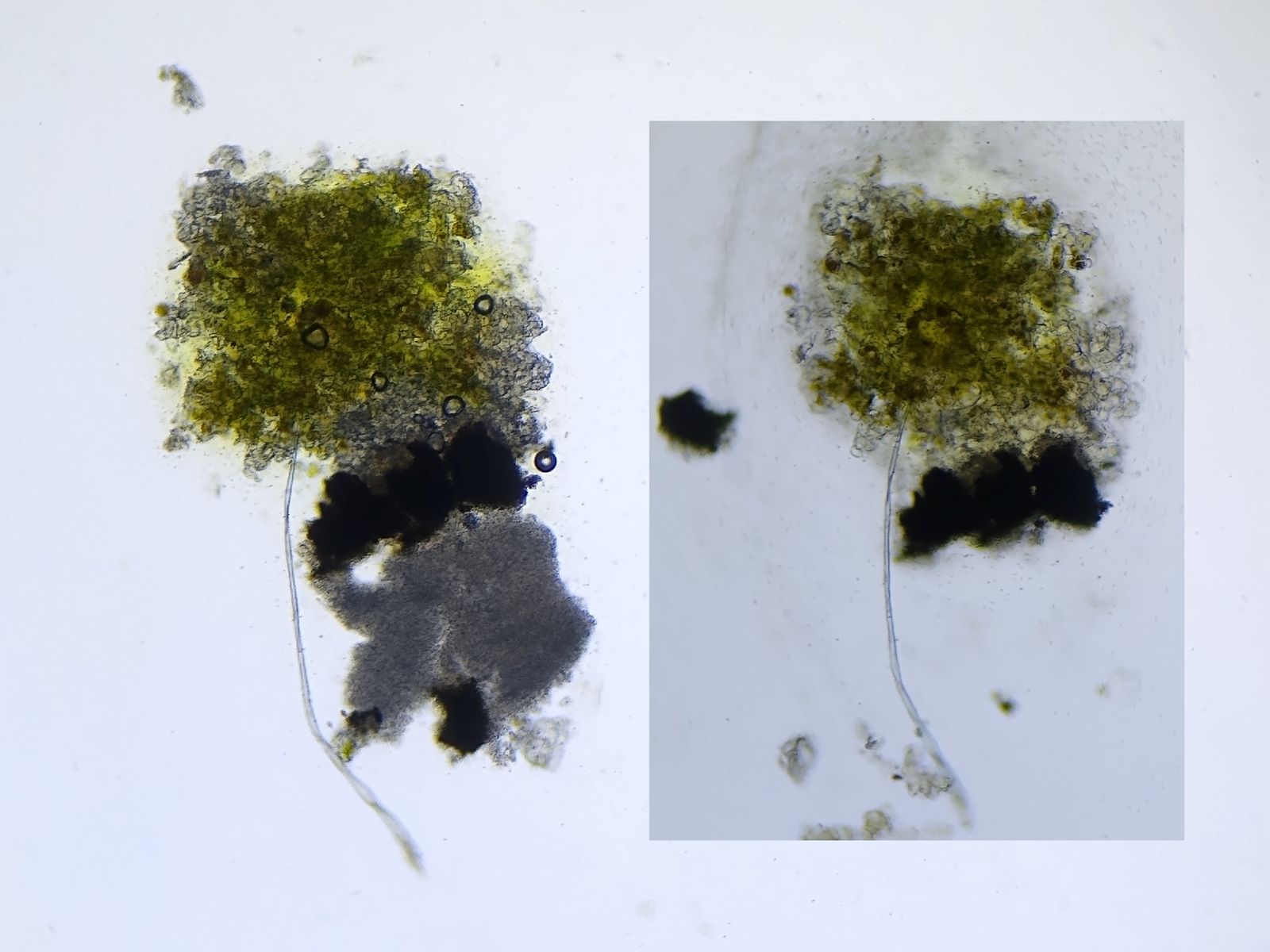 Bild 11 links: gequetschte Pyknidie mit weißlicher Konidienmasse, rechts: nach KOH-Zugabe löst sich die Konidenmasse in Einzelzellen auf