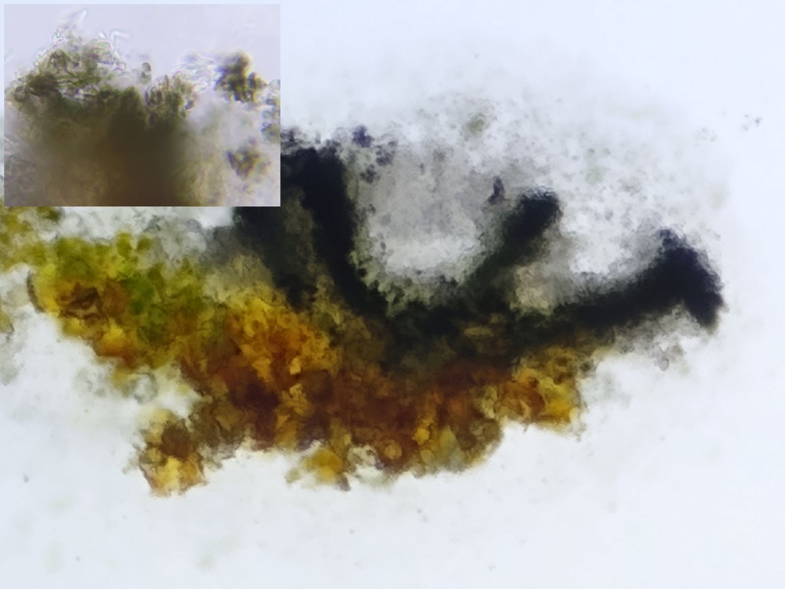 Bild 10: Gleicher, ungequetschter Querschnitt in verd. KOH (wg. Öl nur 100x). Excipulum grünlich verfäbt (Bildeinsatz 1000x).