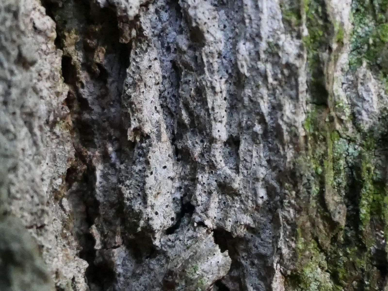 Beim Betrachten der Borke mit der Handlupe fallen winzige, schwärzliche Fruchtkörperbildungen auf.