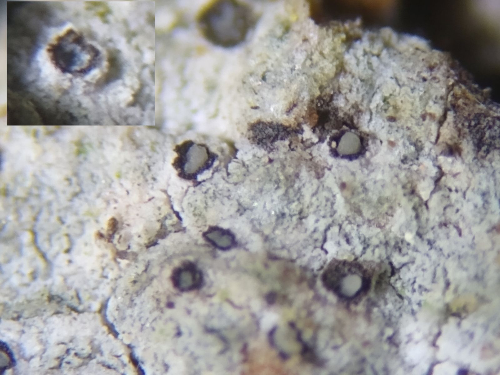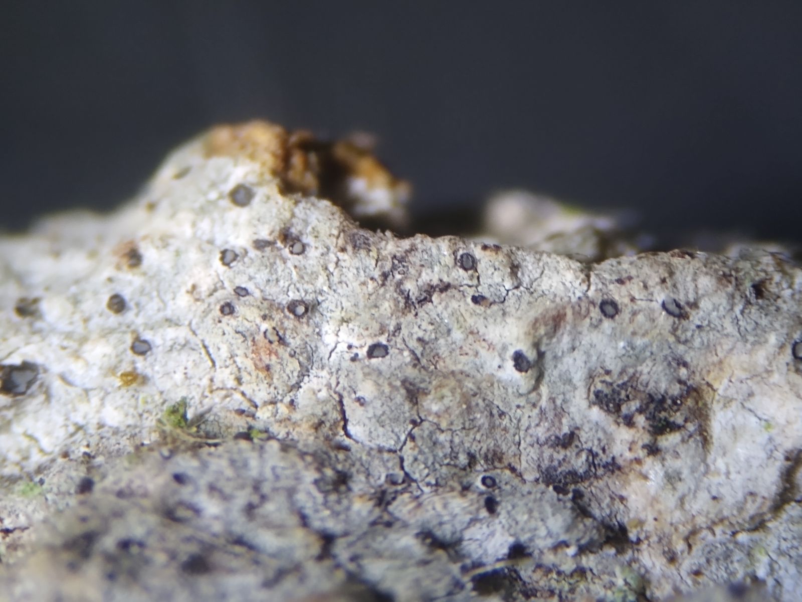 Bild 3 Trockener, weißlicher, rissiger Thallus mit bräunlichen Flecken und dunklen Pyknidien unter der Streolupe