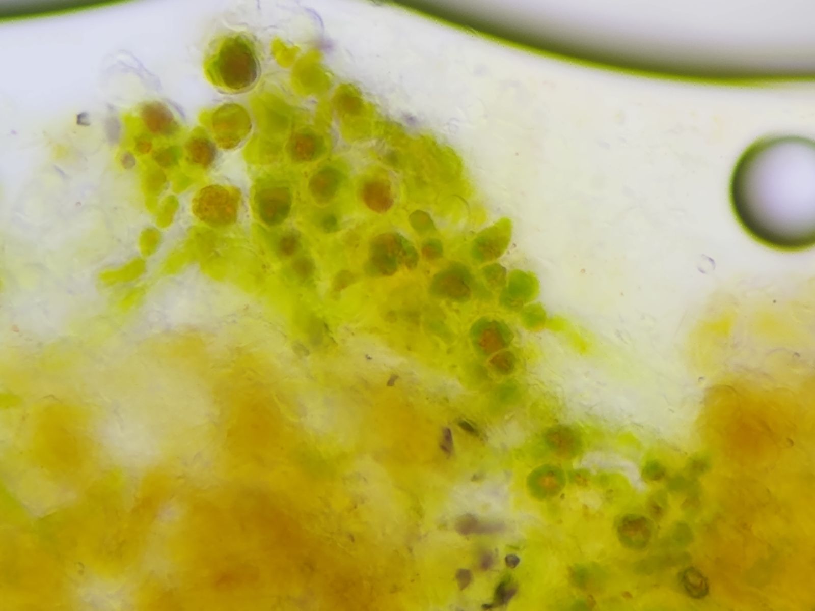 Bild 8 Trentepohlia-Algenzellen mit typ. orangen Tröpfchen im Zytoplasma