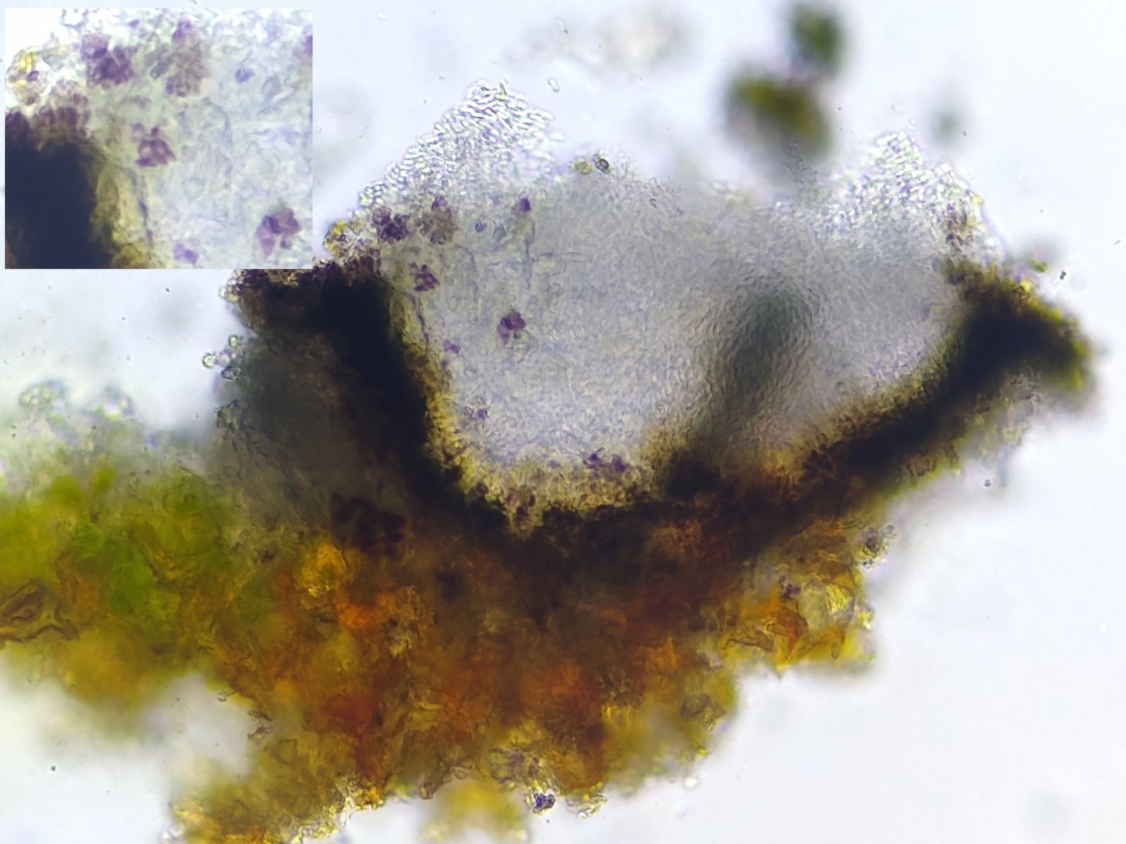Das Excipulum zeigt an dünnen Abschnitten eine bräunliche bis violette Färbung.