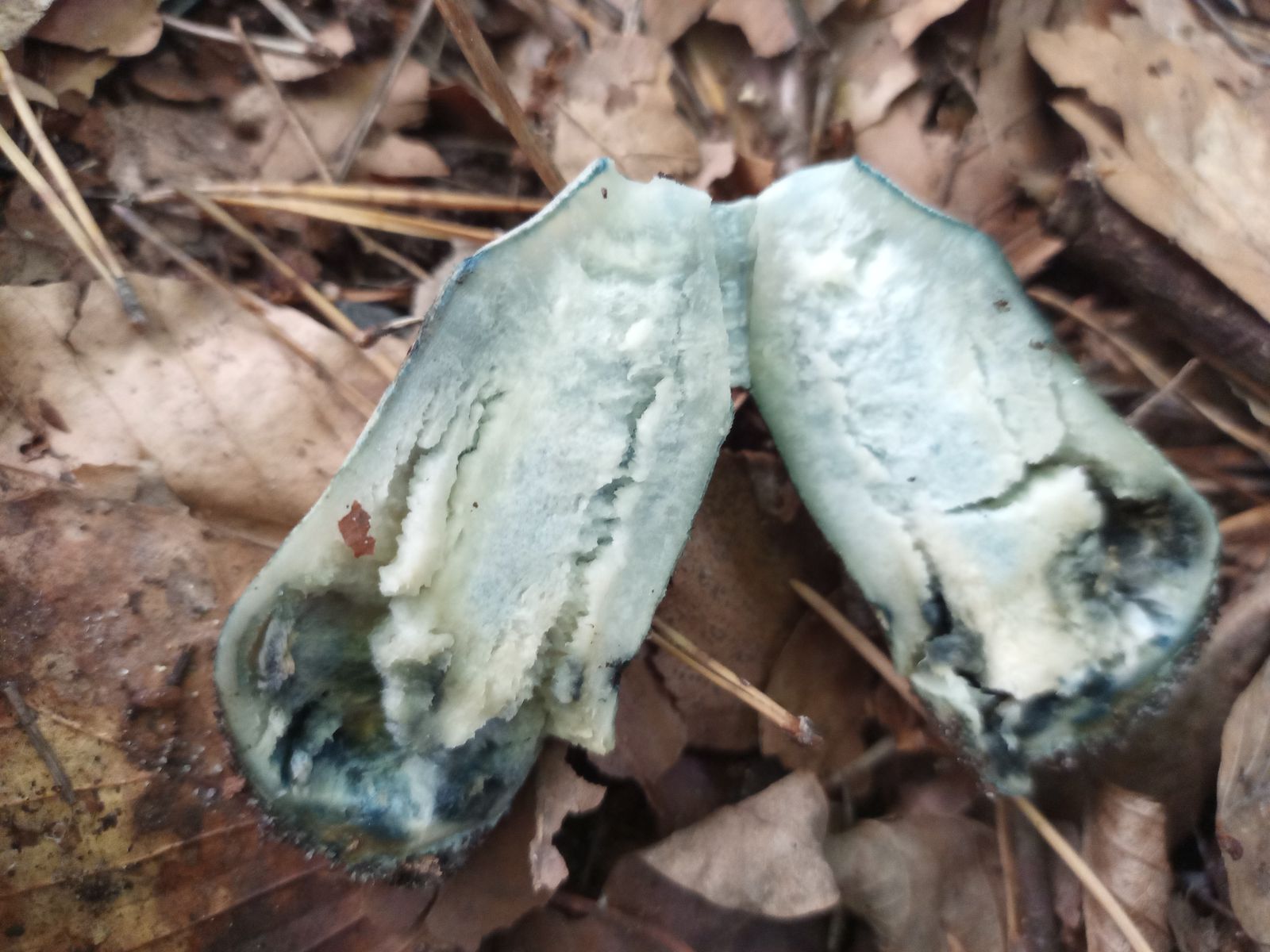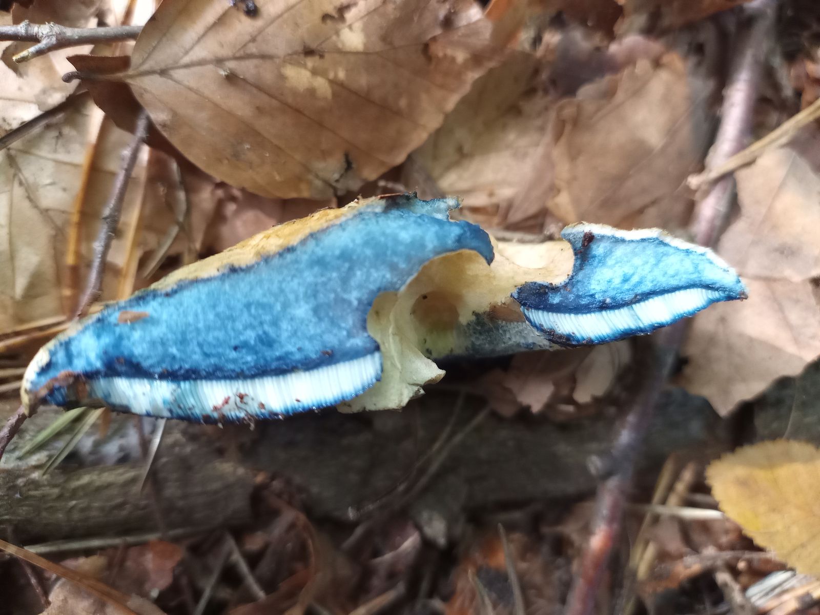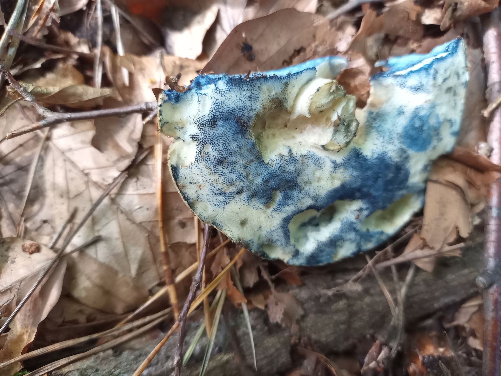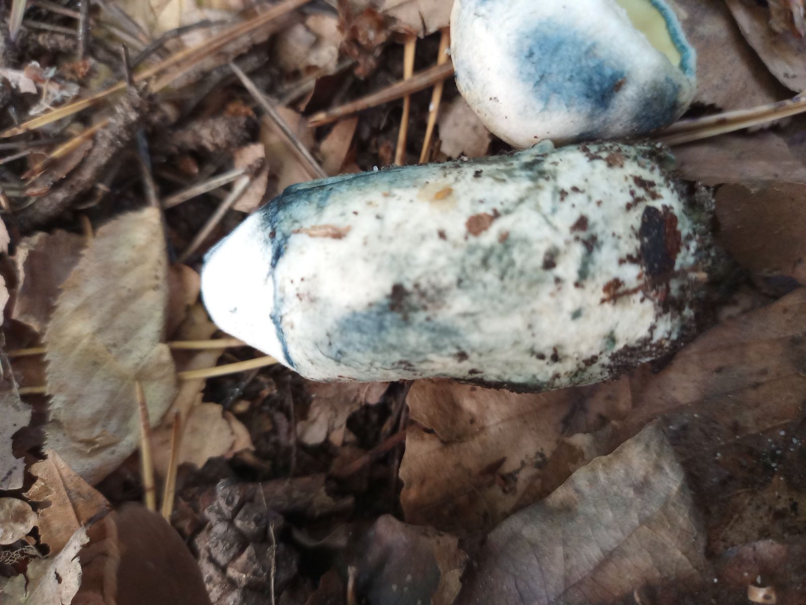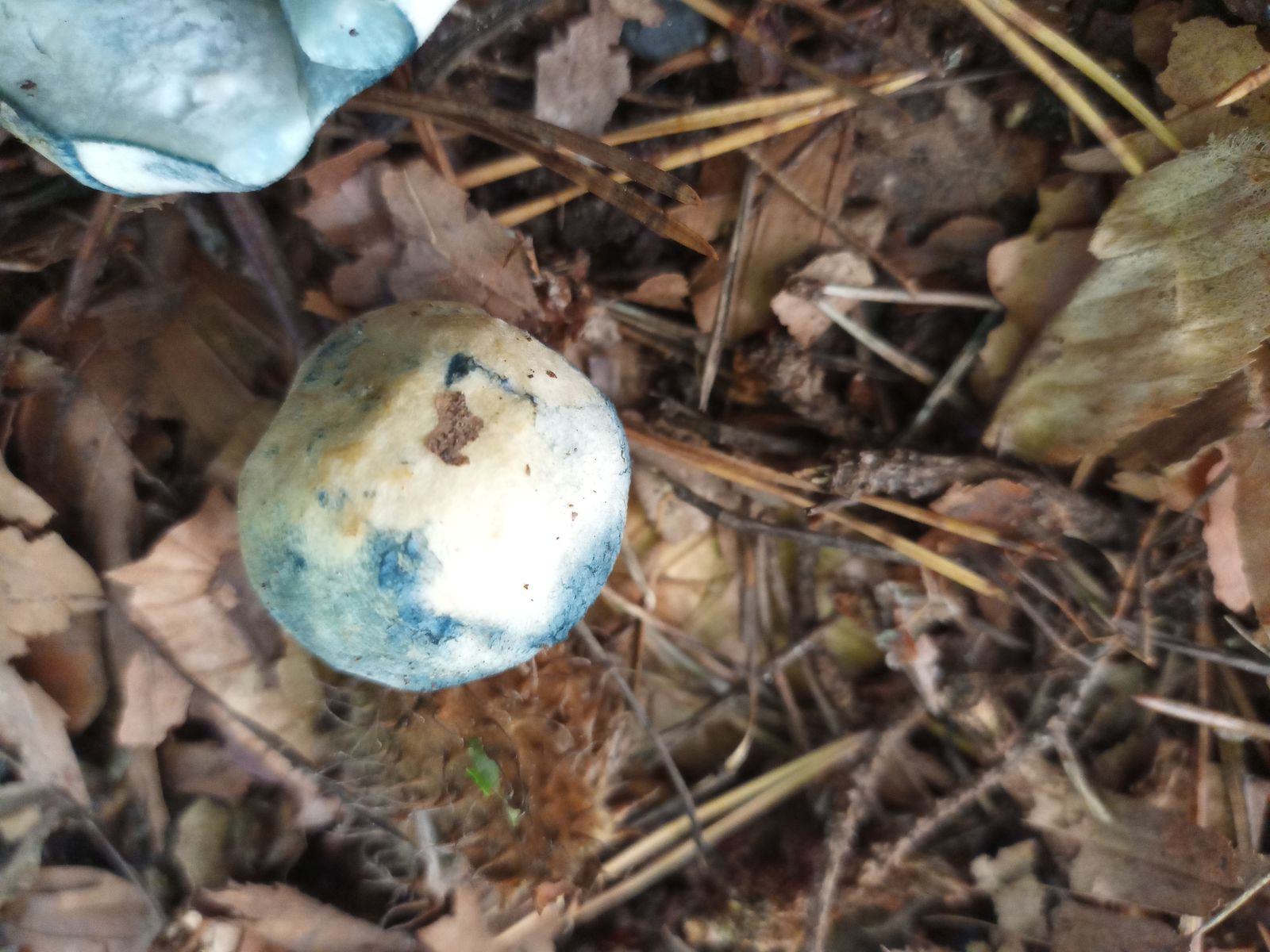 Der Nächste war leider schon umgetreten. Zunächst war ich ob der hellen Röhrenenden und der hellen, fast weißen Huthaut relativ ratlos. Die blauen Spuren überall haben ihn dann als Kornblumenröhrling (Gyroporus cyanescens agg.) verraten. Später fand ich daneben noch ein kleineres Exemplar.