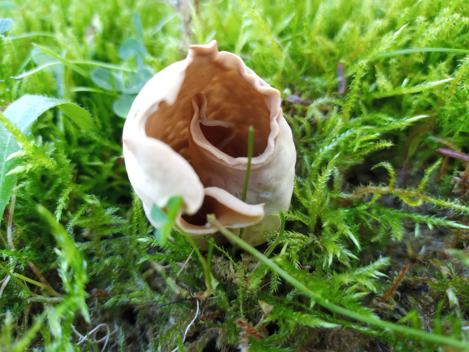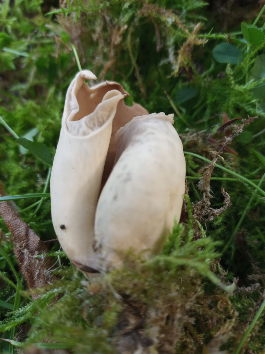 Im Park dann später ein Schlauchpilz, von dem ich vermutete, es sei ein Eselsohr (Otidea onotica). Zu Hause recherchierte ich dann, dass der oft Rottöne, besonders an der Innenseite hat. Der gefundene Pilz war aber innen hellbraun ohne jedes Rot und außen beige. Ich denke, das passt dann nicht. Aber was dann?