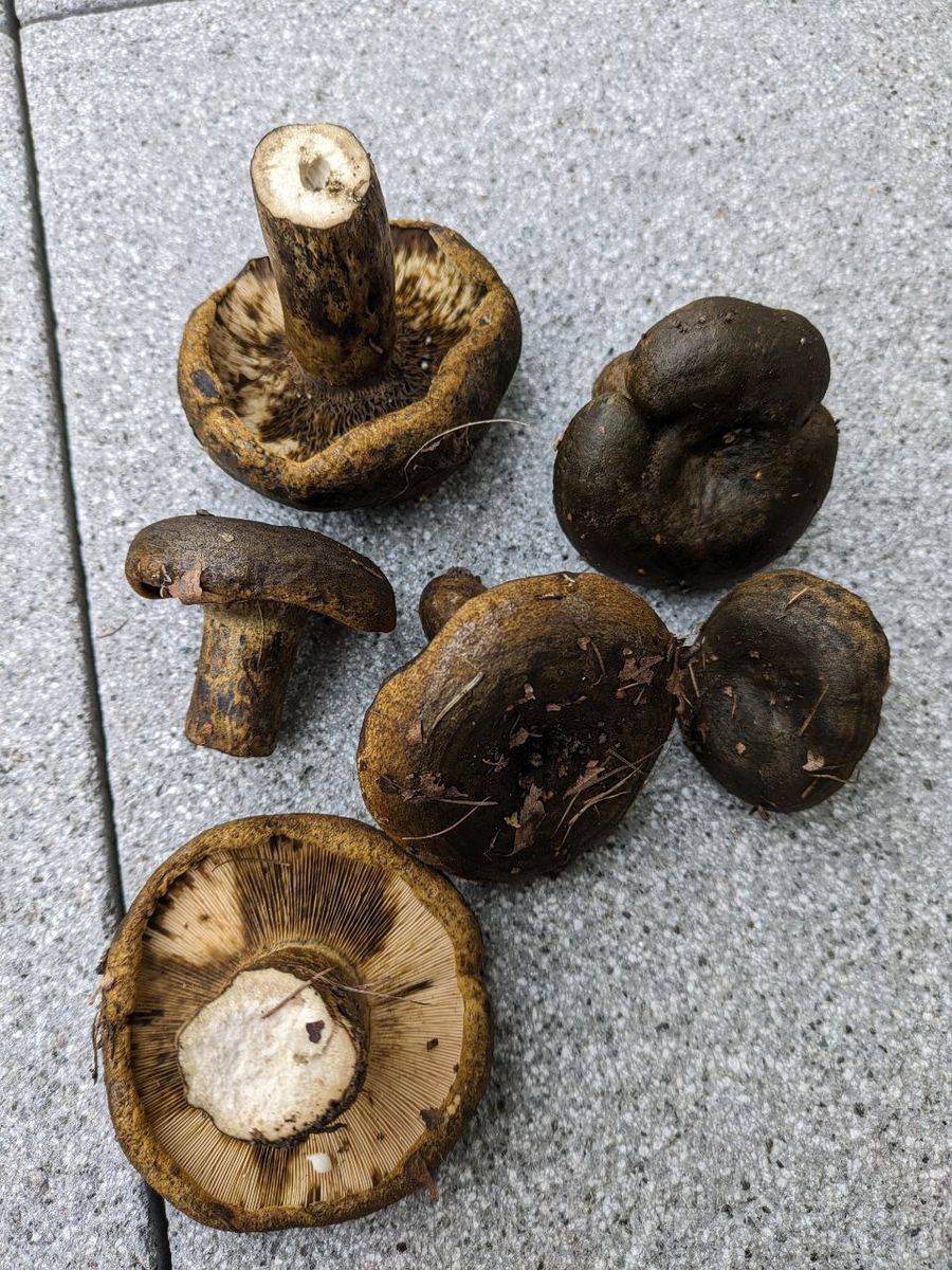 In dem Birken/Fichtenwäldchen eventuell auch mit Hainbuchen standen auch noch andere Pilze, und nicht zu knapp. Diese Pilze hätte ich als Täublinge identifiziert, sie haben eine schmutzig-Olivgrün bis dunkelbraune Hutfarbe, teilweise mit konzentrisch angeordneten Ringmustern. Der Hut ist am Rand stark eingerollt. Der Fuß ist ebenfals schutzig olivgrün und genauso dunkel wie der Hut. Einige der Exemplare haben dunkle Stellen an den sonst chremefarbenen Lamellen. Ich bin der Meinung, das sind die Pilze die die Dame mit dem russischen oder ukrainischen Akzent in ihrem Beutel hatte. Man könnte auf die Idee kommen, dass es der Hainbuchenmilchling sein könnte, ich bin jedoch sicher es handelt sich um einen Täubling (siehe Bruchstelle am Stiel, da milcht auch nix). Probiert habe ich ihn bisher nicht.