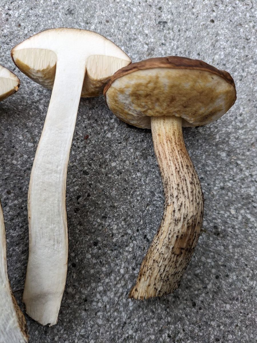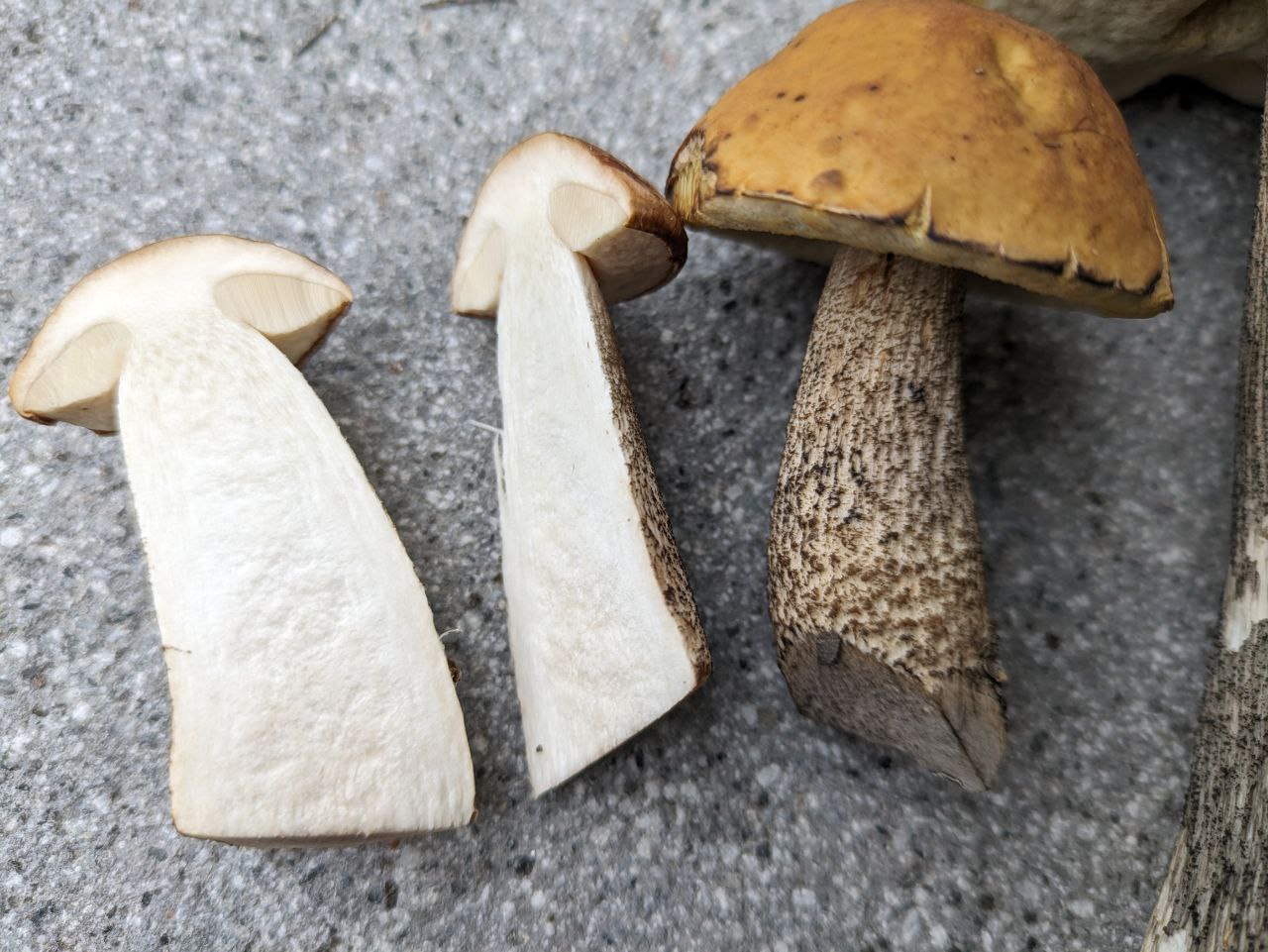Von den Rauhfüßen fand ich noch mehr, an einer anderen Stelle auch zwei mit etwas hellerem Hut und bräunlicheren Schuppen am Stiel (links). Die Huthaut ist leicht überstehend. Der Anschnitt bleibt weiß. Also alles Birkenpilze vermutlich, da eine Rotkappe ja verfärben müsste. Keine Ahnung, Raufußröhrlinge finde ich echt schwierig!