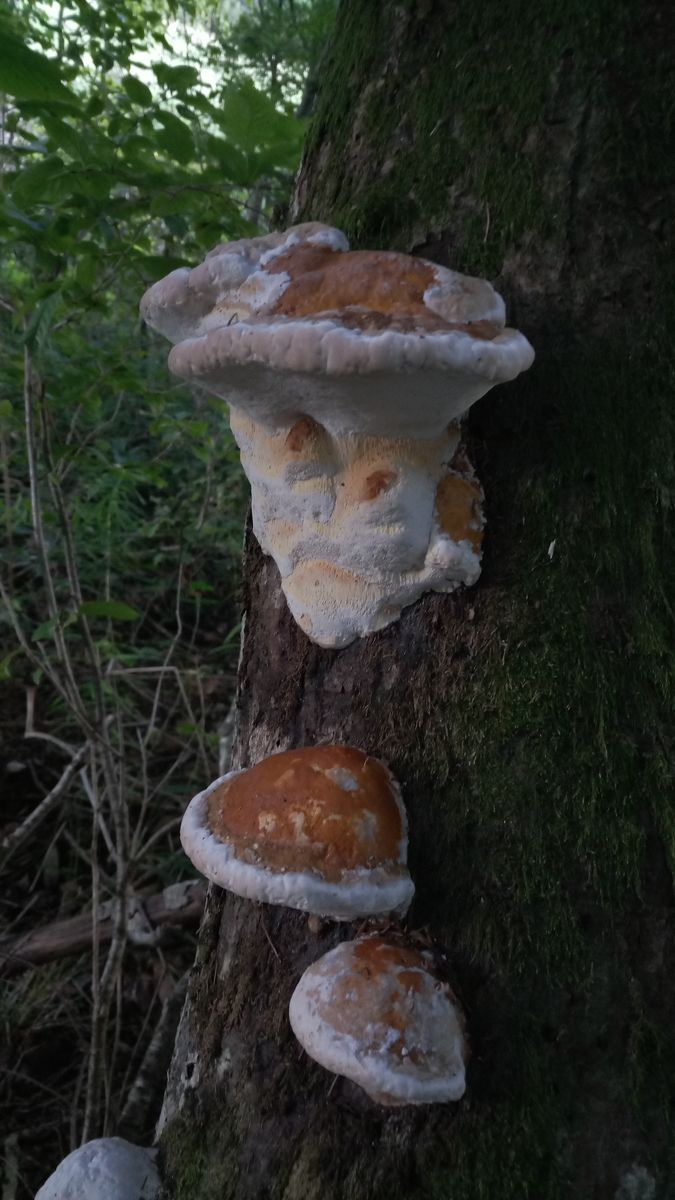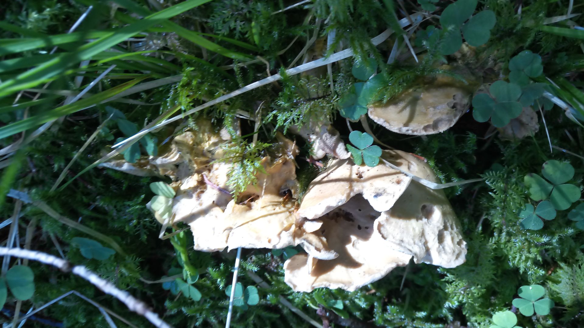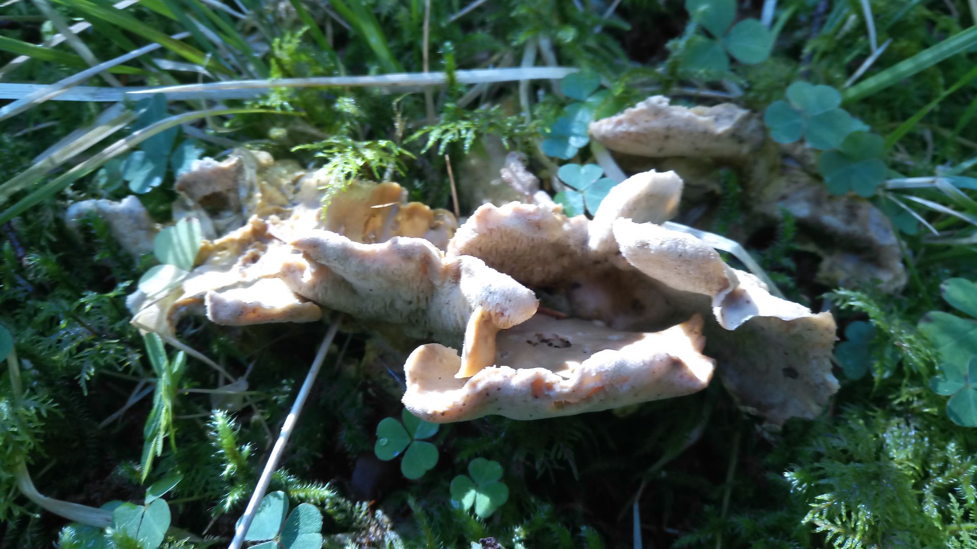Bei diesen alten und schon ziemlich weichen Exemplaren dürfte es sich um den Grünen Kammporling Laeticutis cristata handeln. Man erkennt es auf den Fotos schlecht (meine Handykamera hasst Sonne und Schatten grell nebeneinander), doch der Hut war samtig gelbgrün-olivlich und die Poren gelblich. Obwohl ich mich mit Bodenporlingen schlecht auskenne, war ich mir hier bei der Bestimmung sicher. Perser!