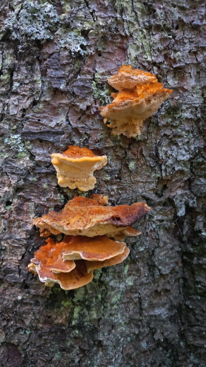 Immer wieder schön finde ich junge Kiefernholz- (oder eher Nadelholz-)Braunporlinge Phaeolus spadiceus. Hier seltsam auf dem "Boden" erscheinend.
