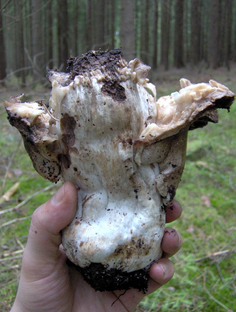 Einen seltsam anmutenden Pilz entdeckte ich dann auf einer Anhöhe, die gänzlich von Fichten und Kiefern bedeckt, mit Fichennadeln übesät und von großen Moosflächen durchzogen ist. Es handelte sich um ein schon sehr altes Examplar, für mich unmöglich zu bestimmen, ungewöhnlich war aber der sehr dicke Stiel, der sehr fest und angenehm im Geruch war. Vom der Kappe war nicht mehr viel übrig, doch konnte man noch deutlich erkennen, dass es sich um einen Pilz mit Lamellen handelt:
