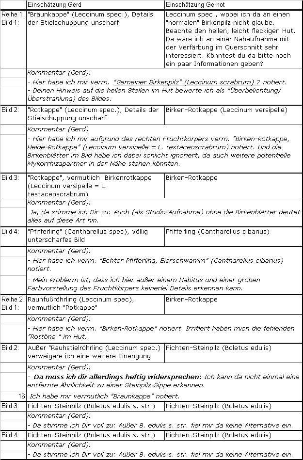 Reihe 1, Bild 1) Das ist eigentlich das einzige Bild, bei dem wir noch e t w a s anderer Ansicht sind. Gerd hält das am Ehesten noch für einen Birkenpilz, wärend ich da nicht mal eine Art favourisiere, da ähnliche Raufußröhrlige makroskopisch nicht zu unterscheiden sind. Wir sind uns auf jeden Fall einig, dass man nur anhand dieses Bildes die Art nicht feststellen kann.