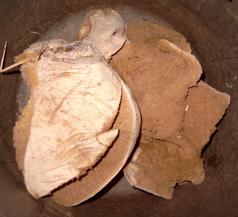 Ich habe kürzlich mitten auf dem Feldweg einen Riesenbovisten gefunden, den jemand da hin geworfen haben muss. Er ist innen schon ganz braun und völlig eingetrocknet. Nun habe ich ihn in einem Eimer im Schuppen, denn ich überlege, ob man draus nicht neue Bovisten züchten kann.