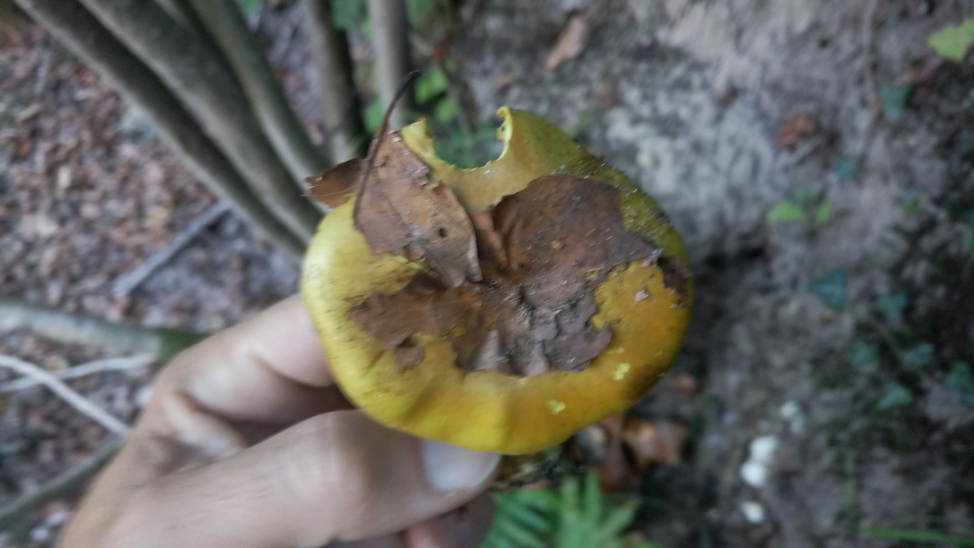 Hut: ca. 7 cm; grüngelb mit rotbräunlichen Sprenkeln (leider nicht sichtbar hier); nicht schleimig (grosse Trockenheit seit Wochen)
