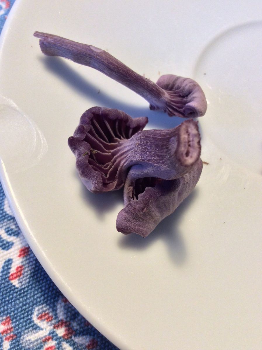 Gestern habe ich zwei, noch nie gesehene, kleine Pilze gefunden. Im Gras, an einem Waldweg. Habe es erst für eine Blume gehalten. Etwa 12 cm hoch, mit herablaufenden Lamellen, ganz auberginenfarbig blau. Der Stiel unten schmal, nach oben breiter werdend. Der Stiel hohl. Kein Ring. Vom Aspekt wie eine Kraterelle. Geruch angenehm.