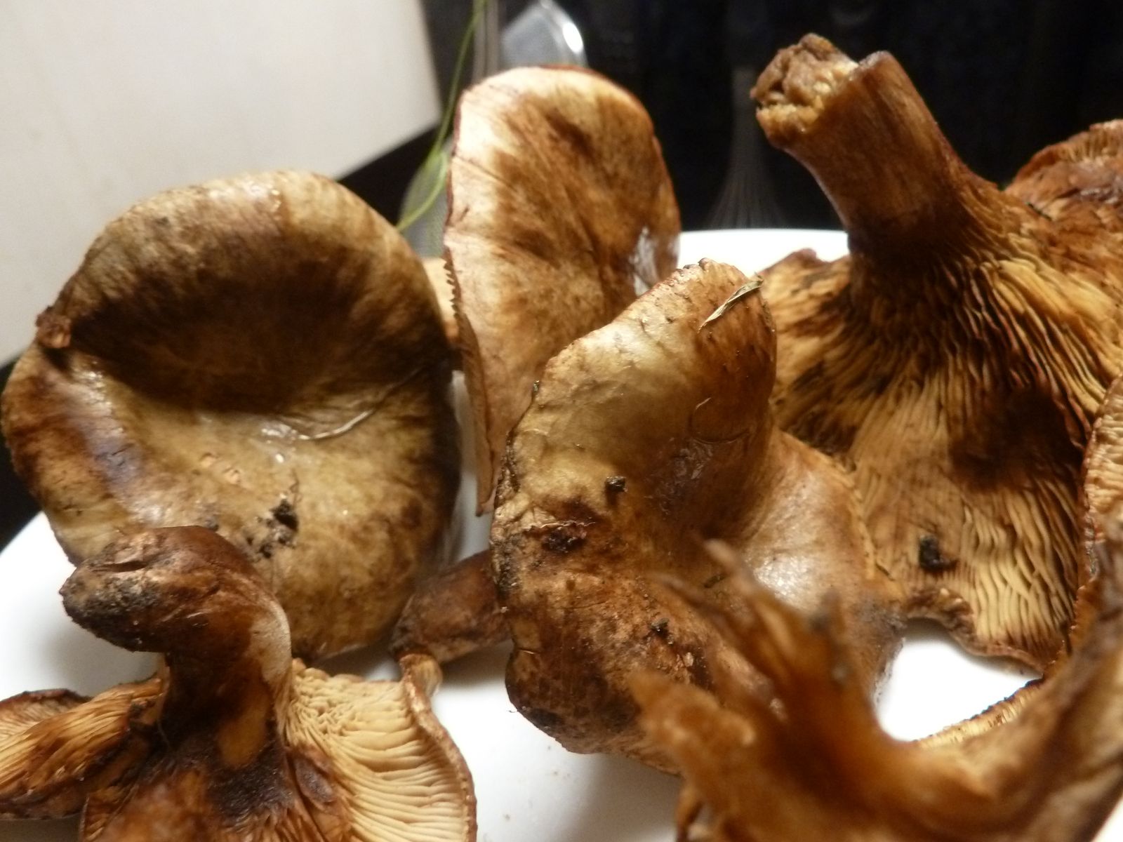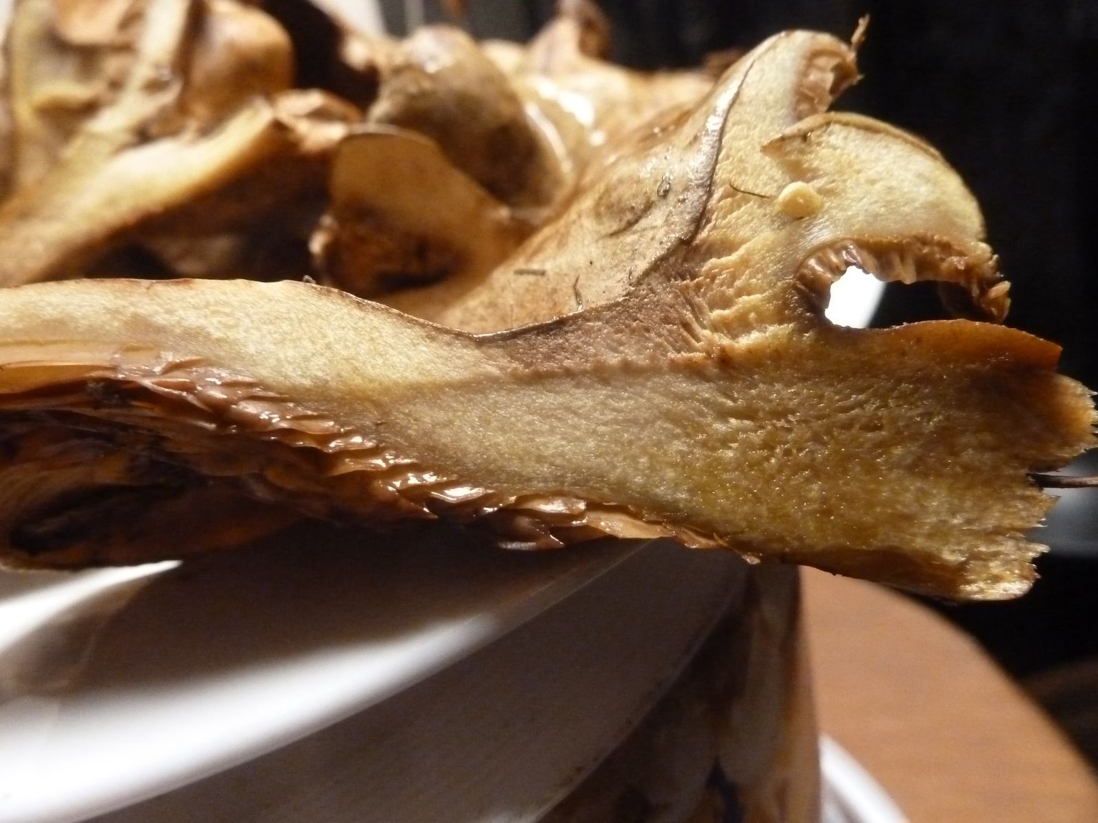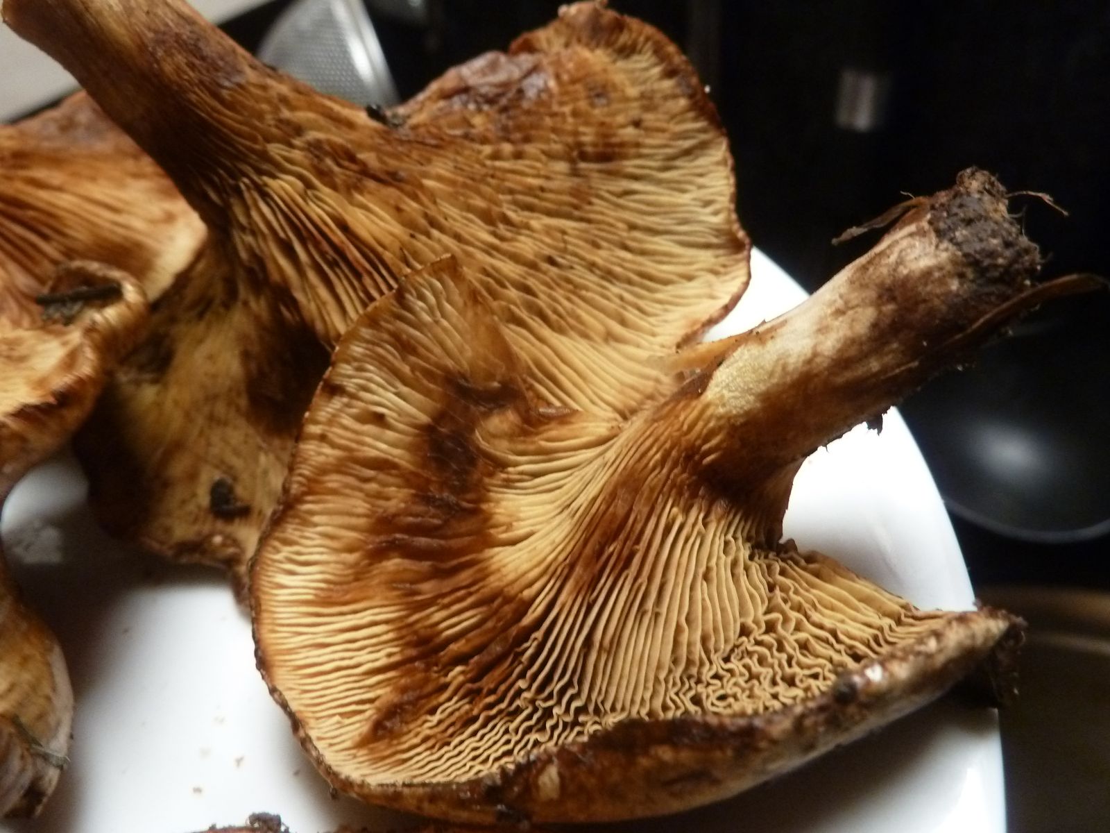 Irgendwo im Internet hatte ich gelesen, dass die Lamellenfarbe und Druckverfärbung von jüngeren Exemplaren mit noch teilweise eingerolltem Hutrand für die Abgrenzung Kahler Krempling / Erlenkrempling neben der Struktur der Huthaut am besten geeignet ist. Der Erlen-Krempling soll etwas heller sein, was die Lamellenfarbe und Druckflecken angeht.