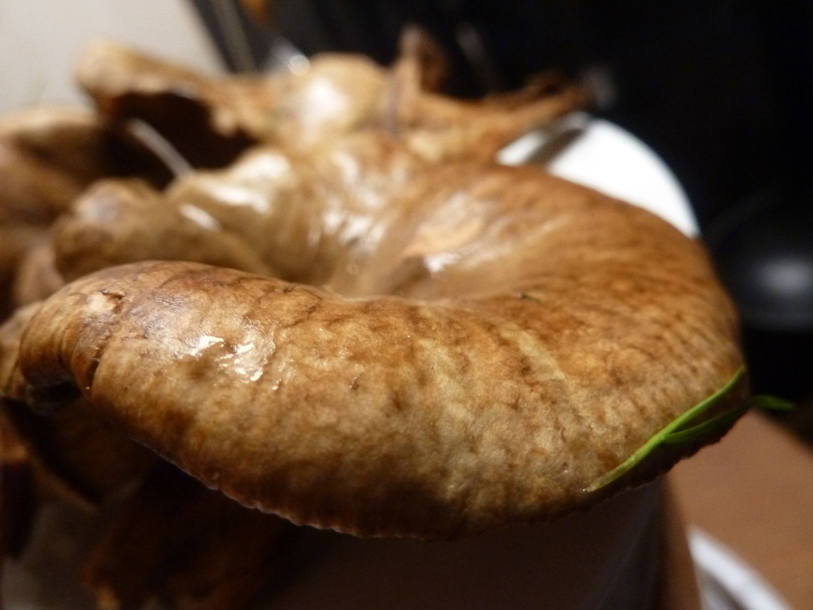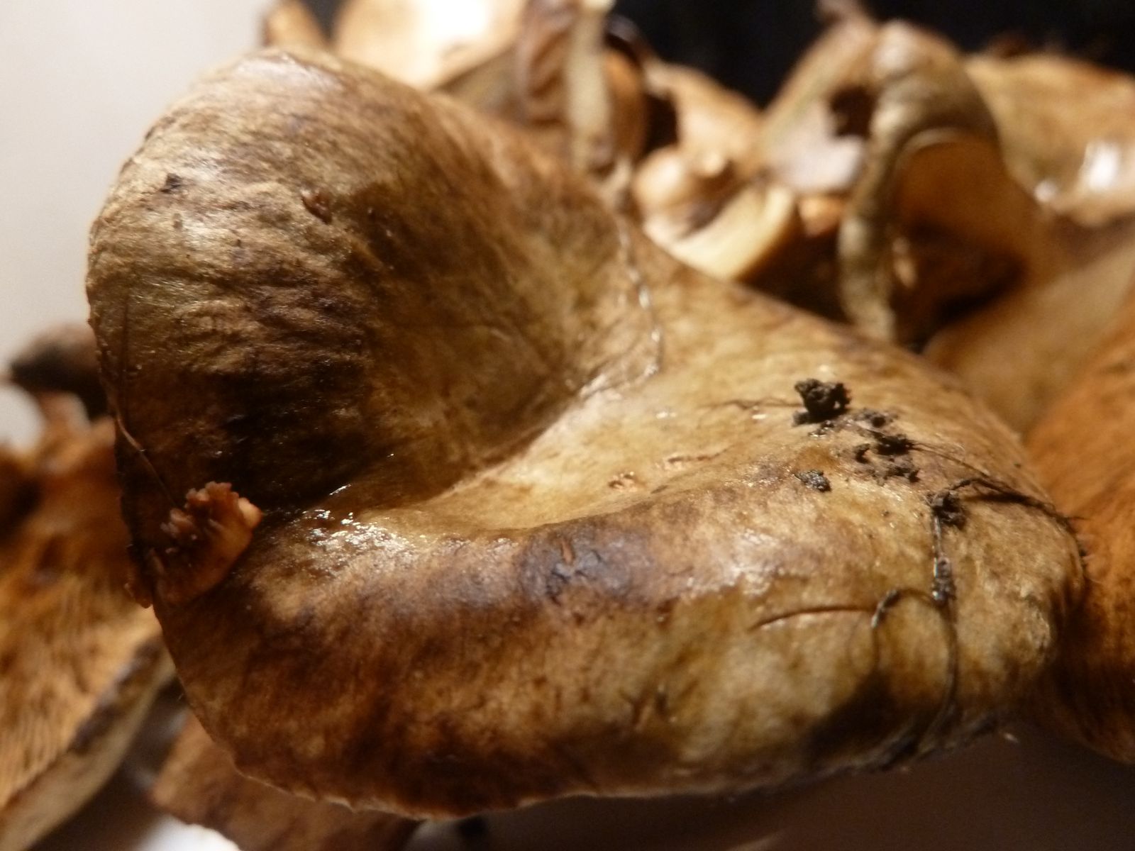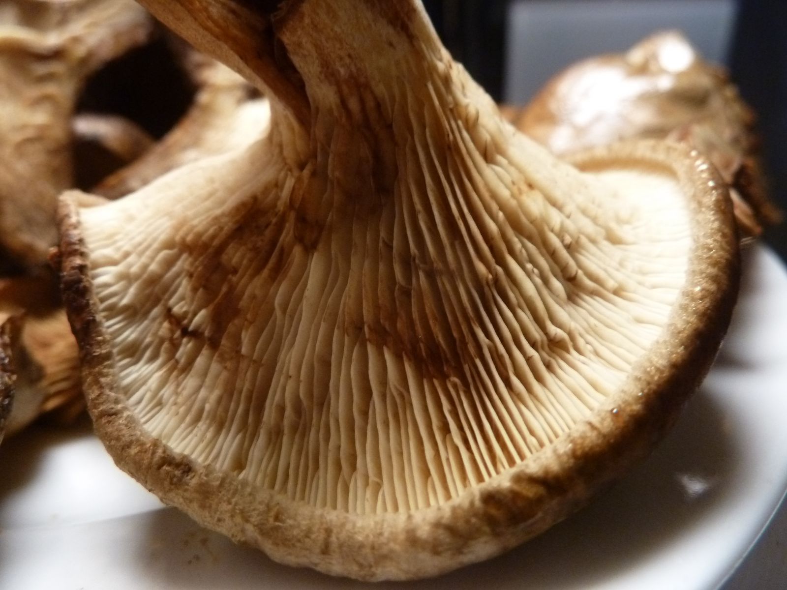 Irgendwo im Internet hatte ich gelesen, dass die Lamellenfarbe und Druckverfärbung von jüngeren Exemplaren mit noch teilweise eingerolltem Hutrand für die Abgrenzung Kahler Krempling / Erlenkrempling neben der Struktur der Huthaut am besten geeignet ist. Der Erlen-Krempling soll etwas heller sein, was die Lamellenfarbe und Druckflecken angeht.