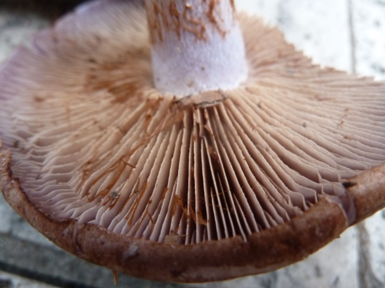 Interessant ist die deutlich violettblaue Fleischfarbe direkt unter der Huthaut. Die Huthaut selber scheint zweischichtig zu sein und ist etwa zu 2/3 abziehbar. Unter der nussbraunen Oberhaut ist eine heller ockerbraune Unterhaut. Mit KOH färben sich nur die Schleierreste an der oberen Stielhälfte schnell dunkelbraun, ansonsten ist da wenig Farbveränderung festzustellen. Der Geschmack ist völlig mild (Hutfleisch und Lamellen, auch ein fingernagelgroßes Stück Huthaut ist mild). Geruch in der oberen Hälfte eher unauffällig, in der Stielbasis so ganz schwach erdig (möglicherweise von den Erdanhaftungen).