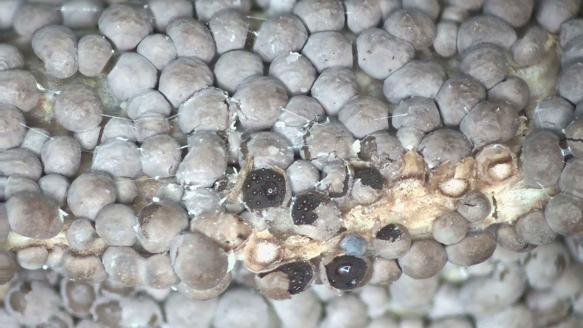 Die Sporengröße ist zwar etwas zu groß, aber die weiße Columella würde für D. crustaceum passen.